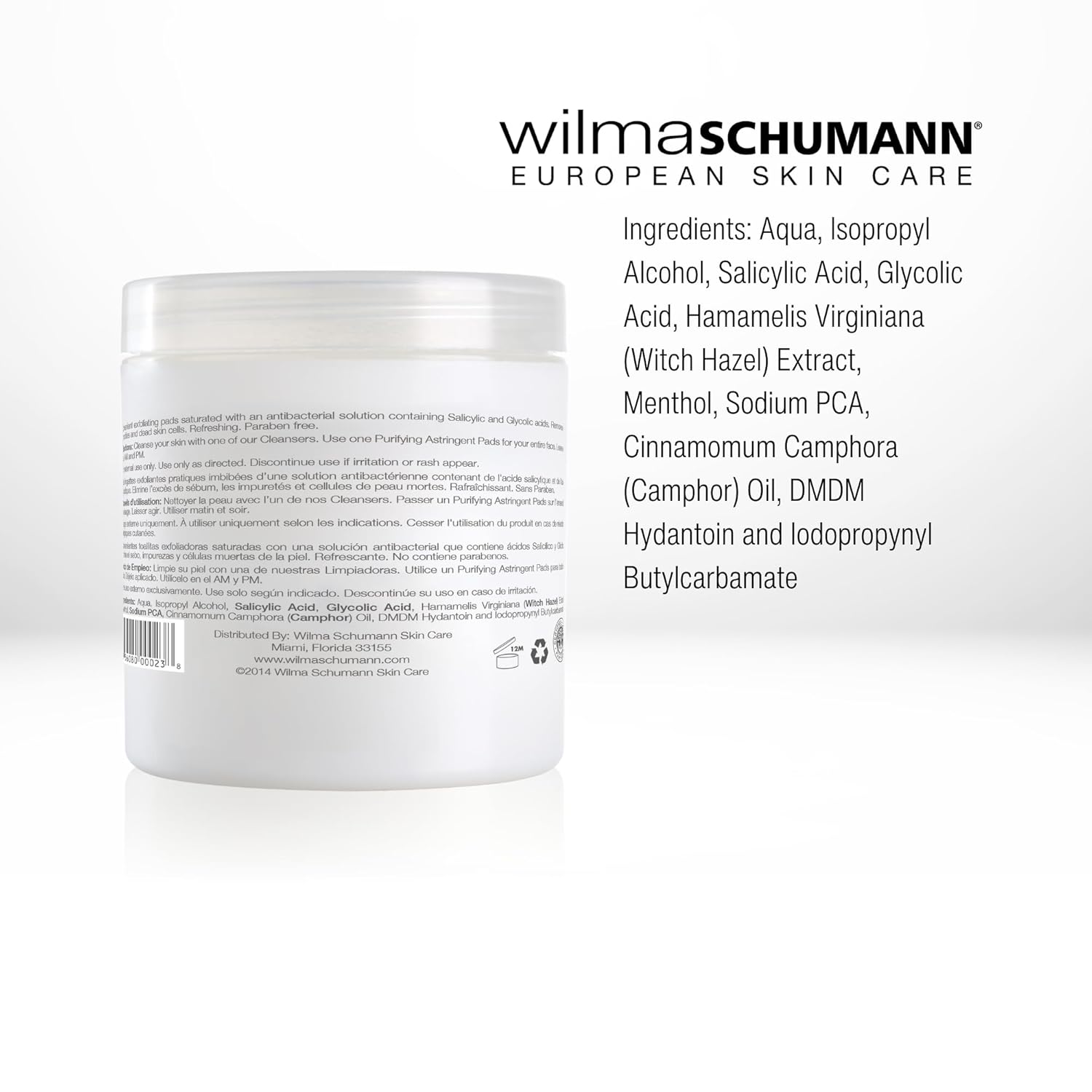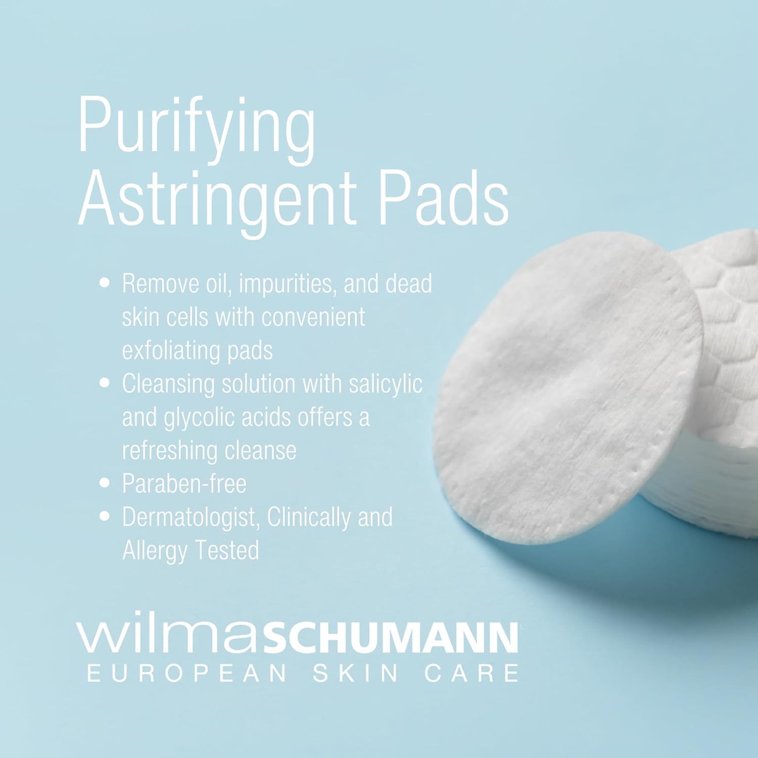 - GENTLE ASTRINGENT PAD: Wilma Schumann's Purifying Astringent Pads remove oil, impurities, and dead skin cells in seconds, revitalizing your complexion and enhancing your skin's natural radiance. Our luxurious skincare solution is designed to cleanse skin without irritating or over-stripping the skin.