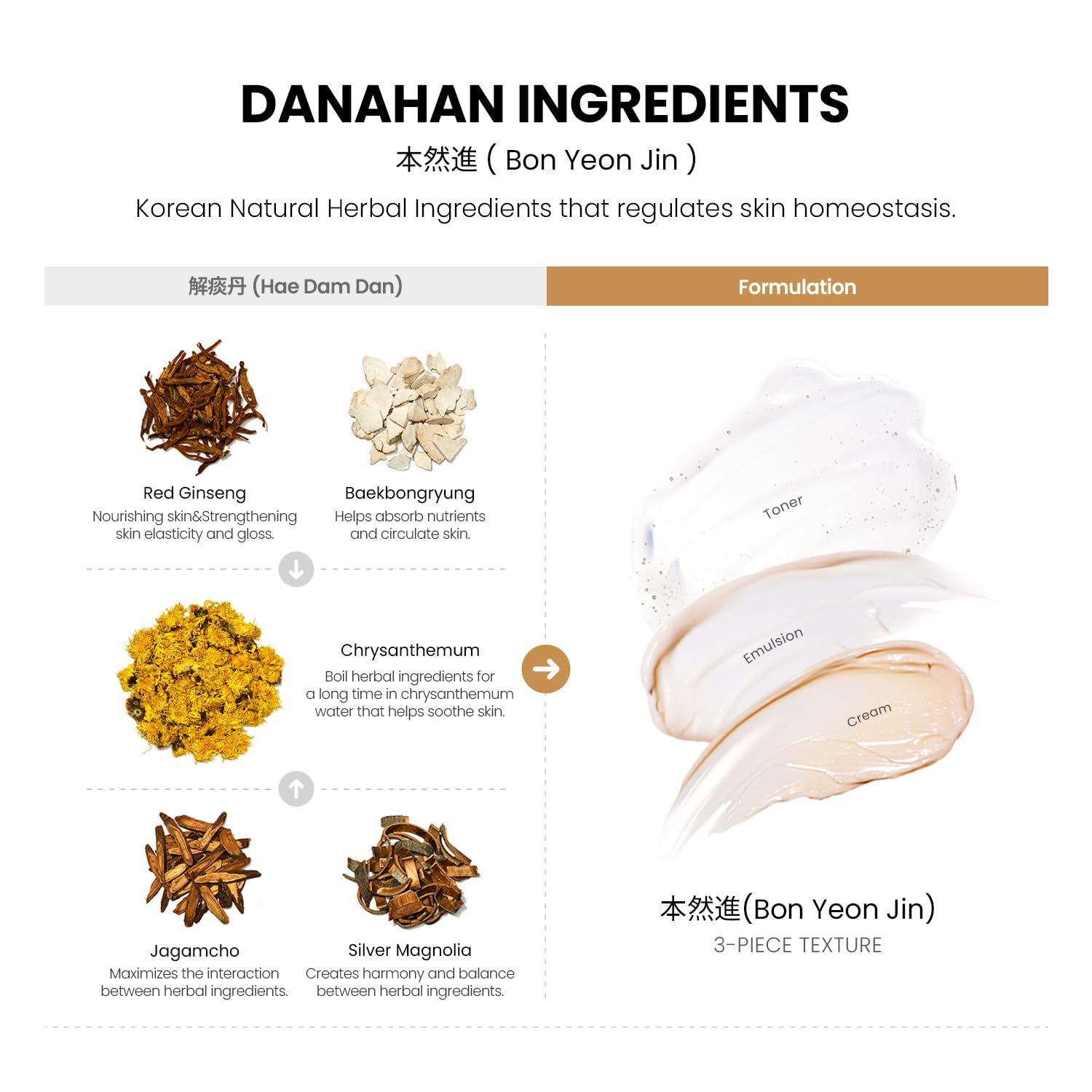 - Danahan Bon Yeon Jin is made with a powerful skin-rejuvenating formula of high-quality Red Ginseng and natural Korean natural herbal medicine to hydrate, nourish, and visibly rejuvenate skin.