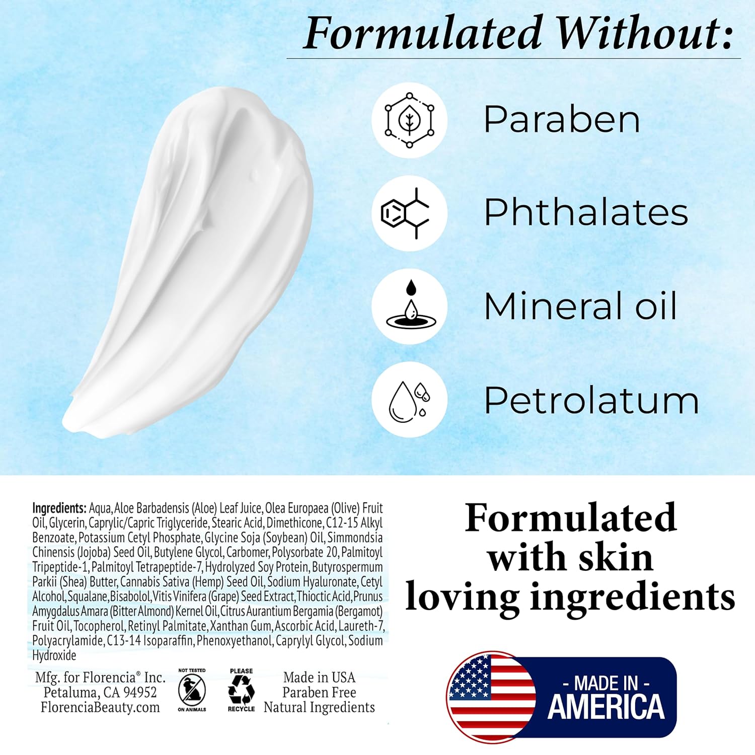 - NATURAL, SAFE, EFFECTIVE SKINCARE β Our facial moisturizer made in USA with the best plant-based ingredients to ensure you have the best experience. Hypoallergenic Formula, Cruelty Free, No Paraben, Mineral Oil Free.