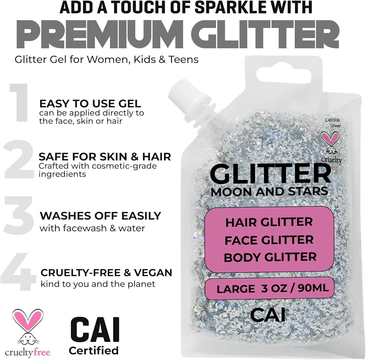 - Face Glitter Gel That Pops: Shine bright with bold face glitter featuring moon and star shapes in a chunky, holographic mix. Easy to blend over cheeks and eyes, it’s ideal for Halloween makeup glitter, raves, or cosplay without irritation or fallout.