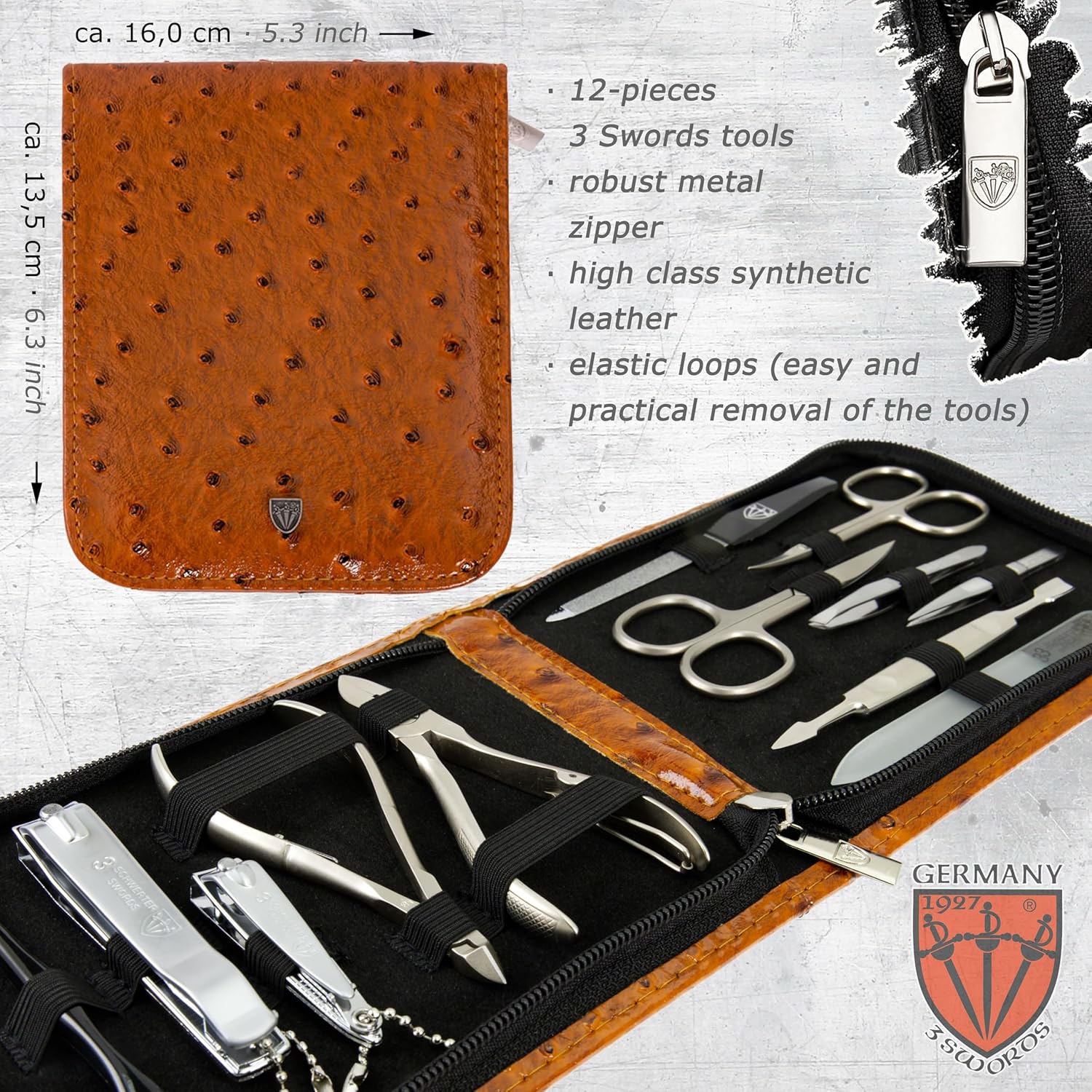 - CASE: Synthetic leather bostrich cognac, size ca. 17,0 x 14,0 x 3,0 cm. Our organizers are made of high-grade fashion or classic materials. Additional equipment: Microfiber cleaning cloth for cleaning steel items, general info sheet โFinger - Nail Groomingโ.