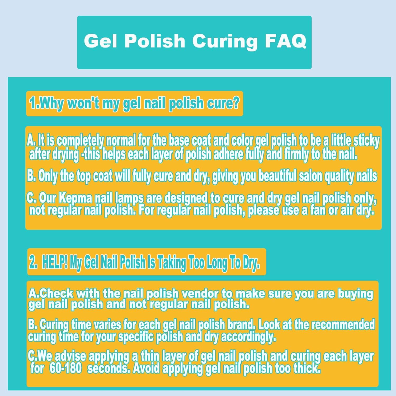 - 1.【Attention Please: The lamp works well with GEL nails but not for TRADITIONAL nail polish】 Dual light sources (wavelength 365nm+405nm), makes it works fastly with gel nail polish(top coat/base coat/color gel),gel stickers and uv resin,but not for traditional nail polish. The traditional nail polish needs to be air dried rather than curing by uv nail lamp.