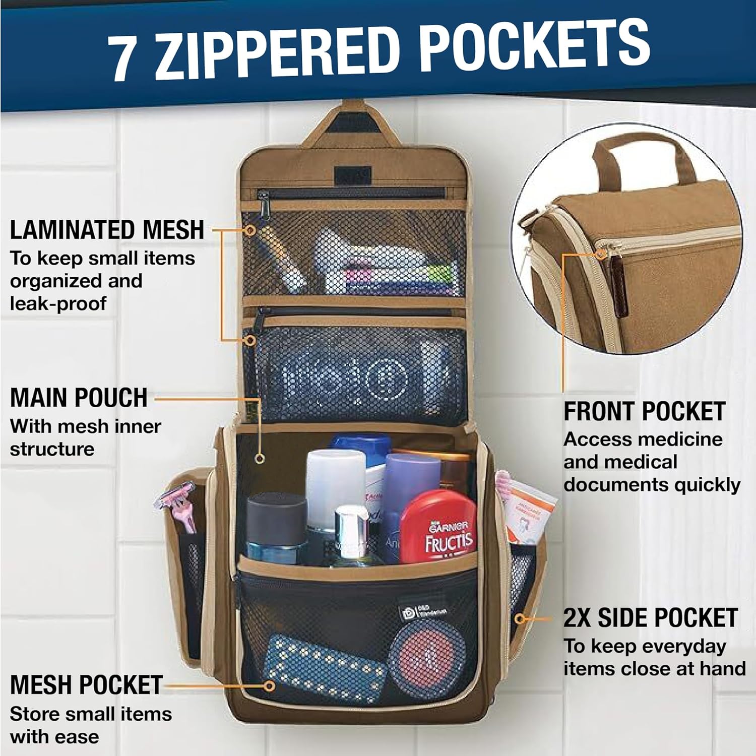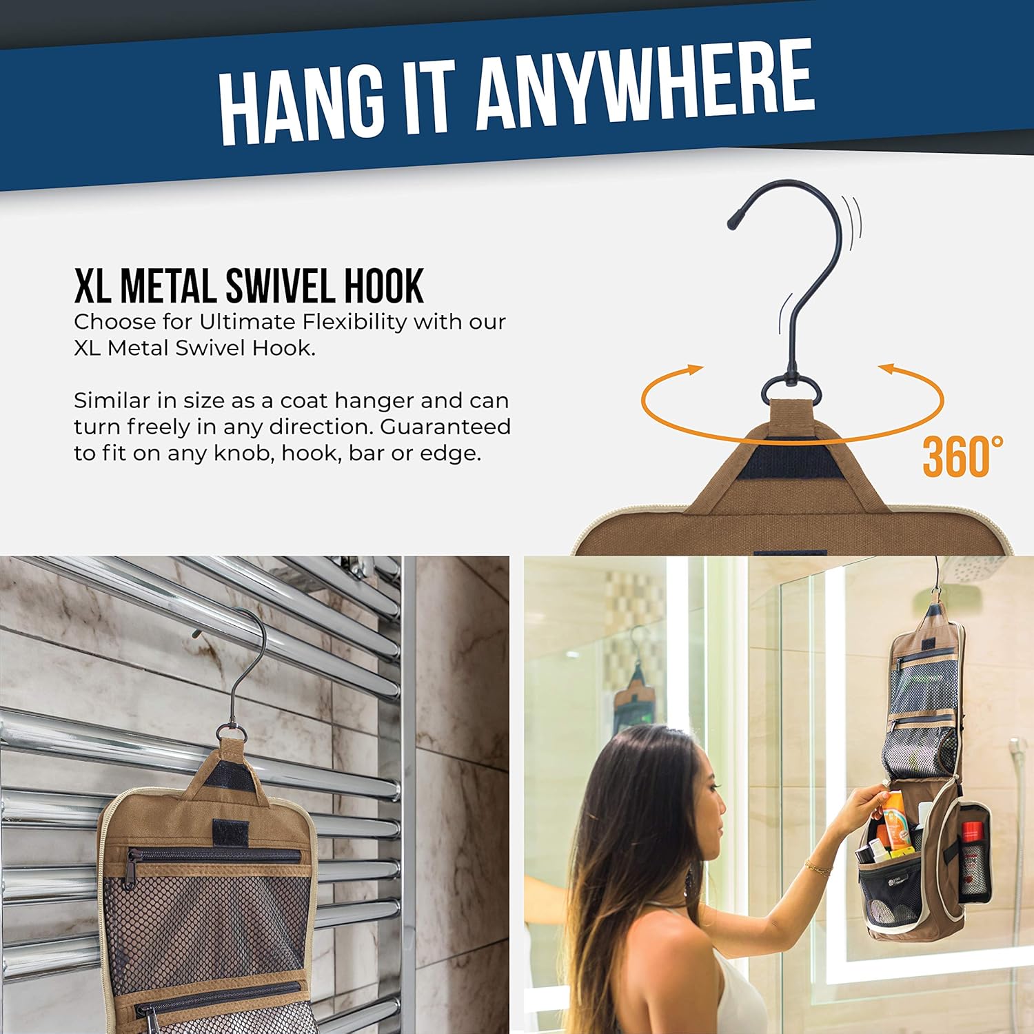 • Convenient Hanging Hook: The XXL metal swivel hook allows you to hang the bag anywhere, saving valuable counter space. It's perfect for use in hotels, bathrooms, or even on a camping trip.