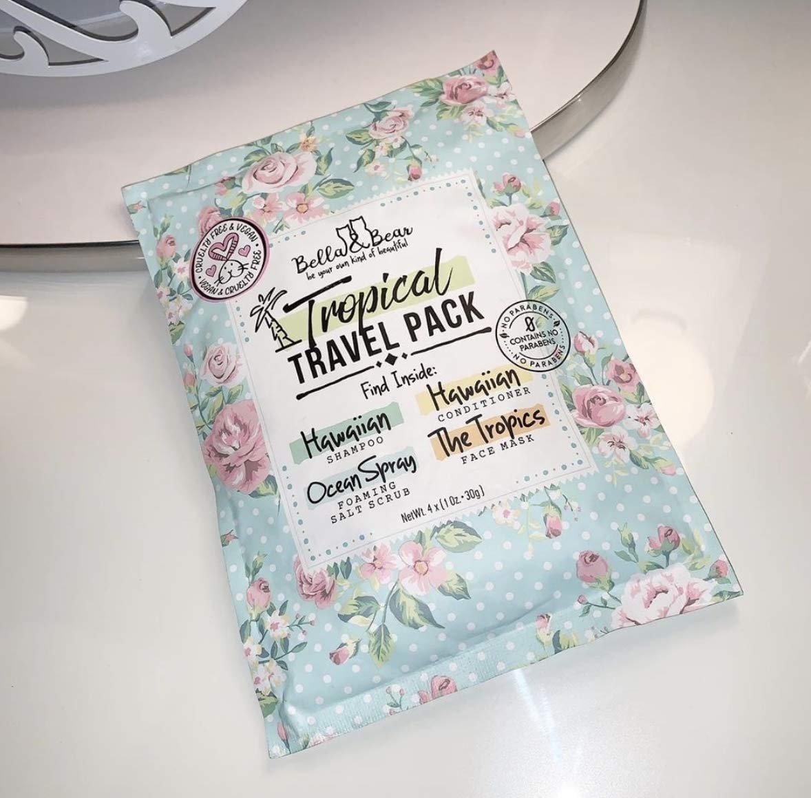 Bella & Bear Tropical Travel Pack, Self Care Kit, Includes Cruelty Free Shampoo, Conditioner, Body Scrub, Face Mask,1oz, Pack of 4