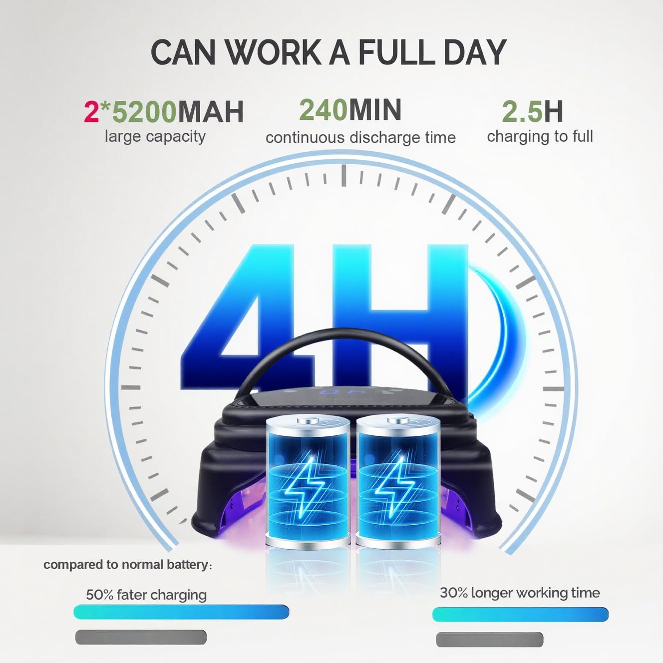 - ★Updated Technology :This is our professional nail dryer with 2PCS 5200mAh built-in battery. It can work continuously for 4 hours after being fully charged for 2.5 hours,you can work with it for a full day, allowing you to use it anywhere you like. The lamp also features a power indicator that shows the remaining battery level.