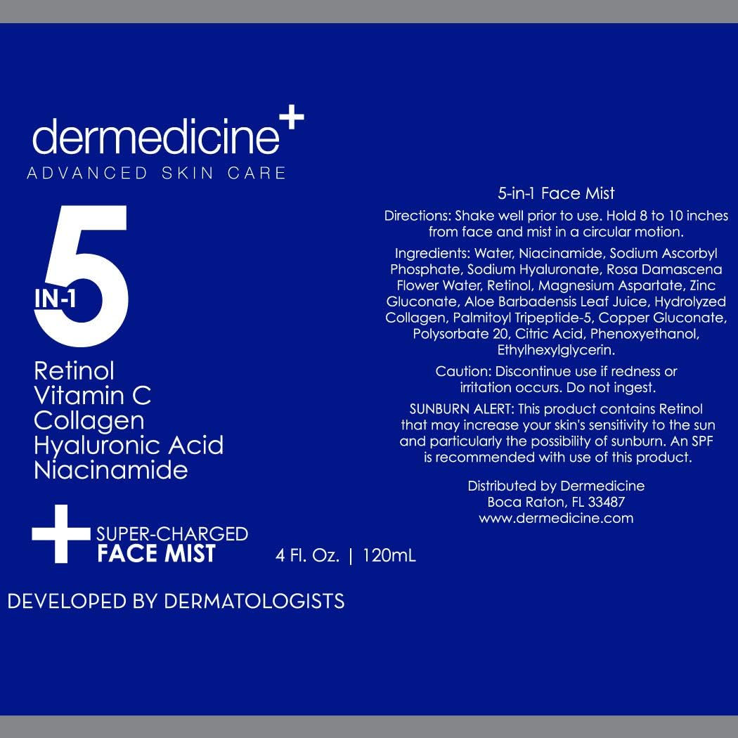 - BRIGHTENS FOR A GLOWING COMPLEXION Our 5 in 1 hydrating face mist contains a blend of active ingredients that work to reveal brighter more youthful-looking skin. This hydrating facial mist works great as a toner spray for your face, neck and chest. Our 5 in 1 face mist is formulated with brightness boosting Vitamin C, Niacinamide, Collagen and Retinol. This Vitamin C facial toner spray works to help improve the appearance of dull, sallow skin to reveal a more radiant-looking complexion.
