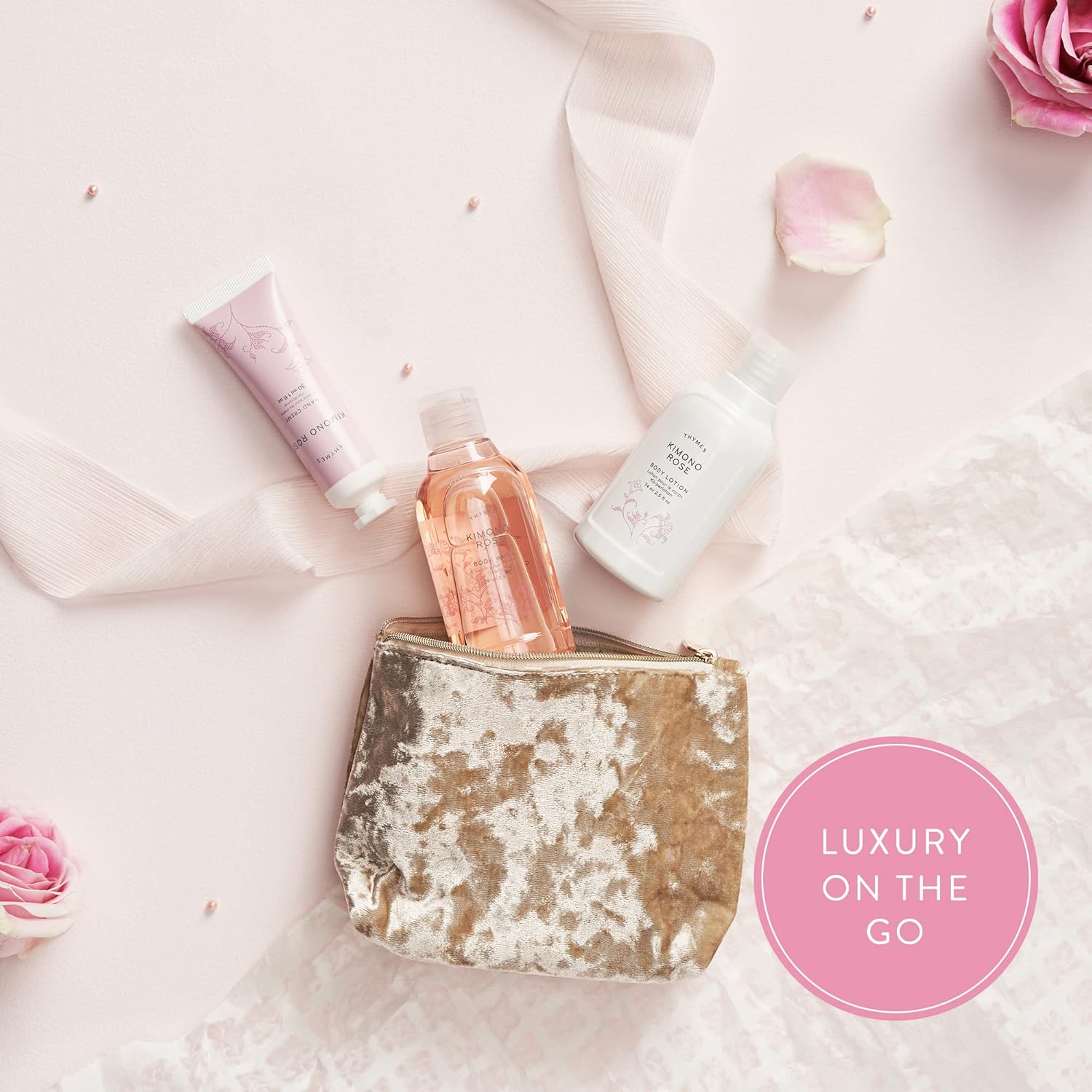 Thymes Travel Set and Beauty Bag - Contains Body Wash, Body Lotion & Hand Cream - Kimono Rose