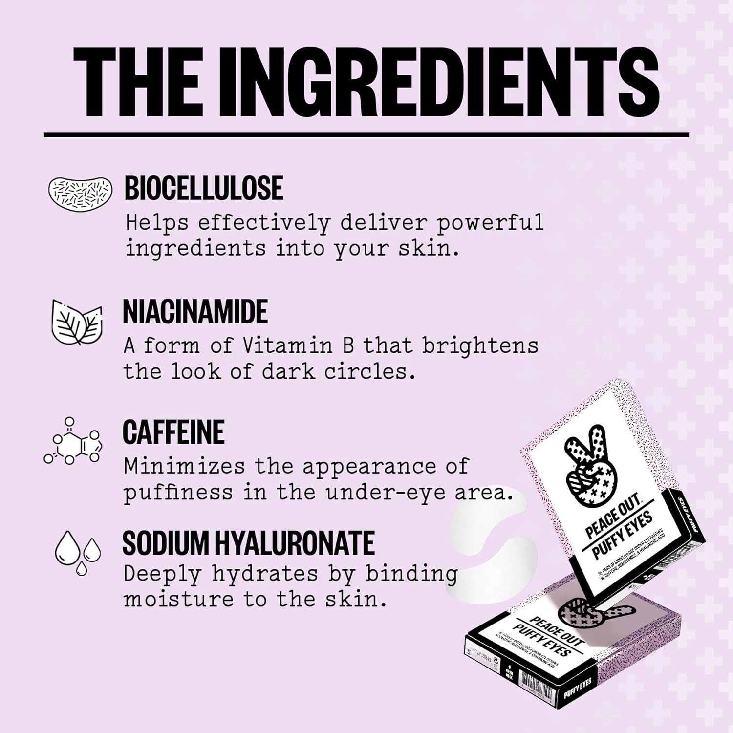 PEACE OUT Skincare Puffy Eyes, Biocellulose Under-Eye Mask, Minimize Puffiness & Tired Eyes with Caffeine and Niacinamide, Under Eye Patches for Dark Circles, 6 pairs