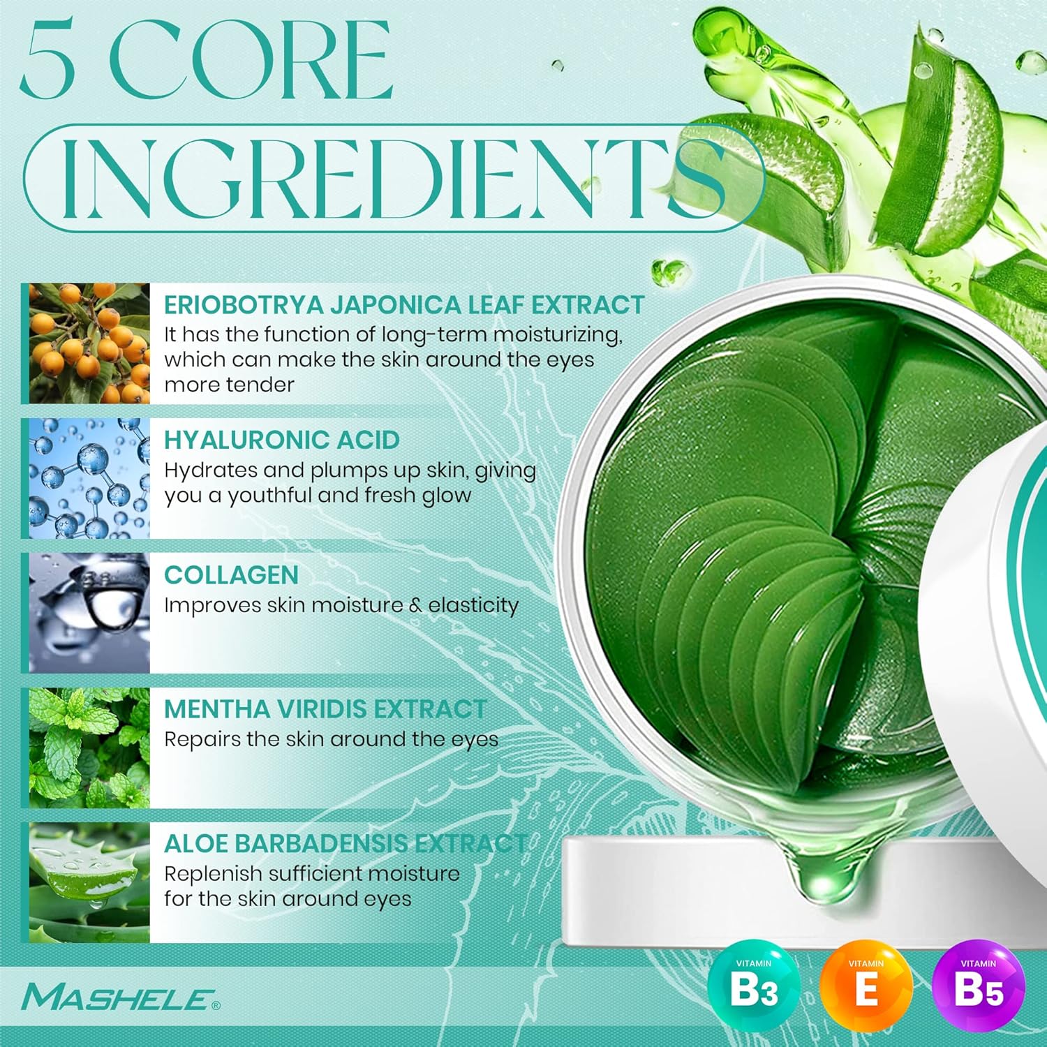 - β [ Moisturizing & Hydrating Under Eye Patches ] Natural anti-wrinkle ingredients that provide a long-lasting moisturizing effect using under eye mask for the skin around the eyes. Your skin will be refreshed and hydrated from the very first use of MASHELE under eye mask patches