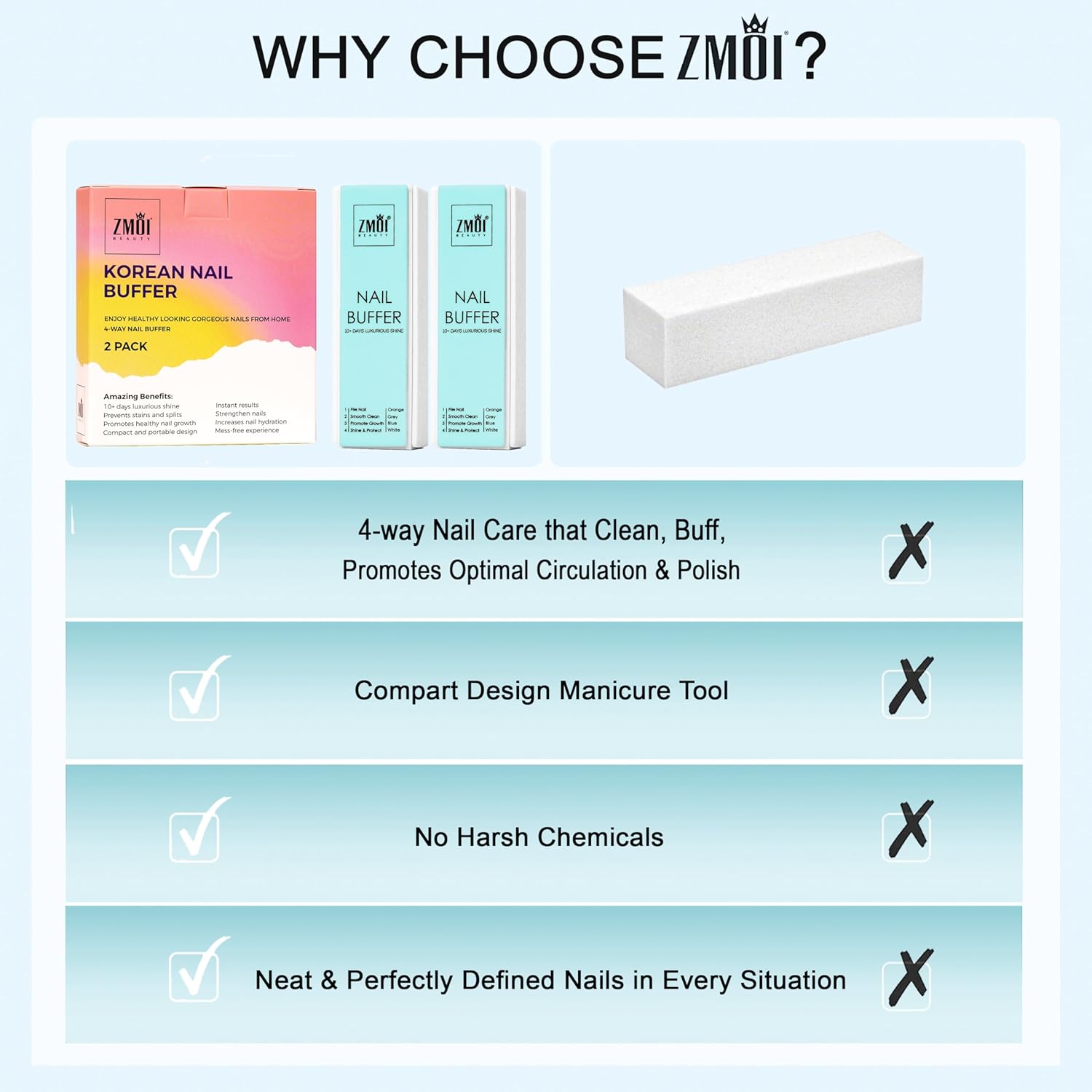 - Practical and Compact: With the ZMOI Korean nail buffer, taking care of your nails has never been this easy! The buffer is comprised of compact and easy-to-use accessories that allow you to trim and groom your nails anywhere and anytime.