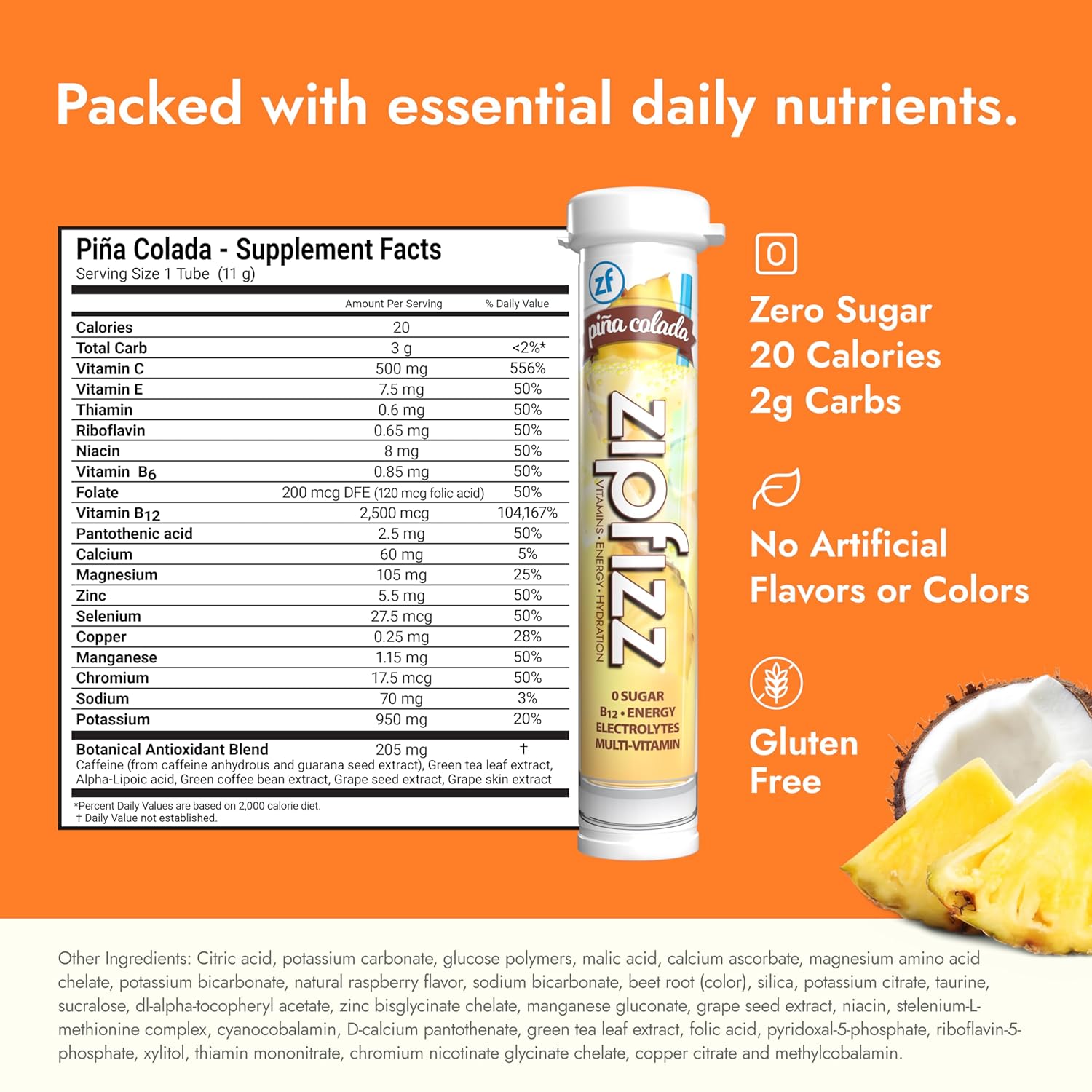 - Tropical Pina Colada Flavor β Enjoy a creamy blend of coconut and sweet pineapple with a perfectly sweet and tropical taste. Simply add Zipfizz powder to 16-20 ounces of water or other non-carbonated beverage, shake, and enjoy!