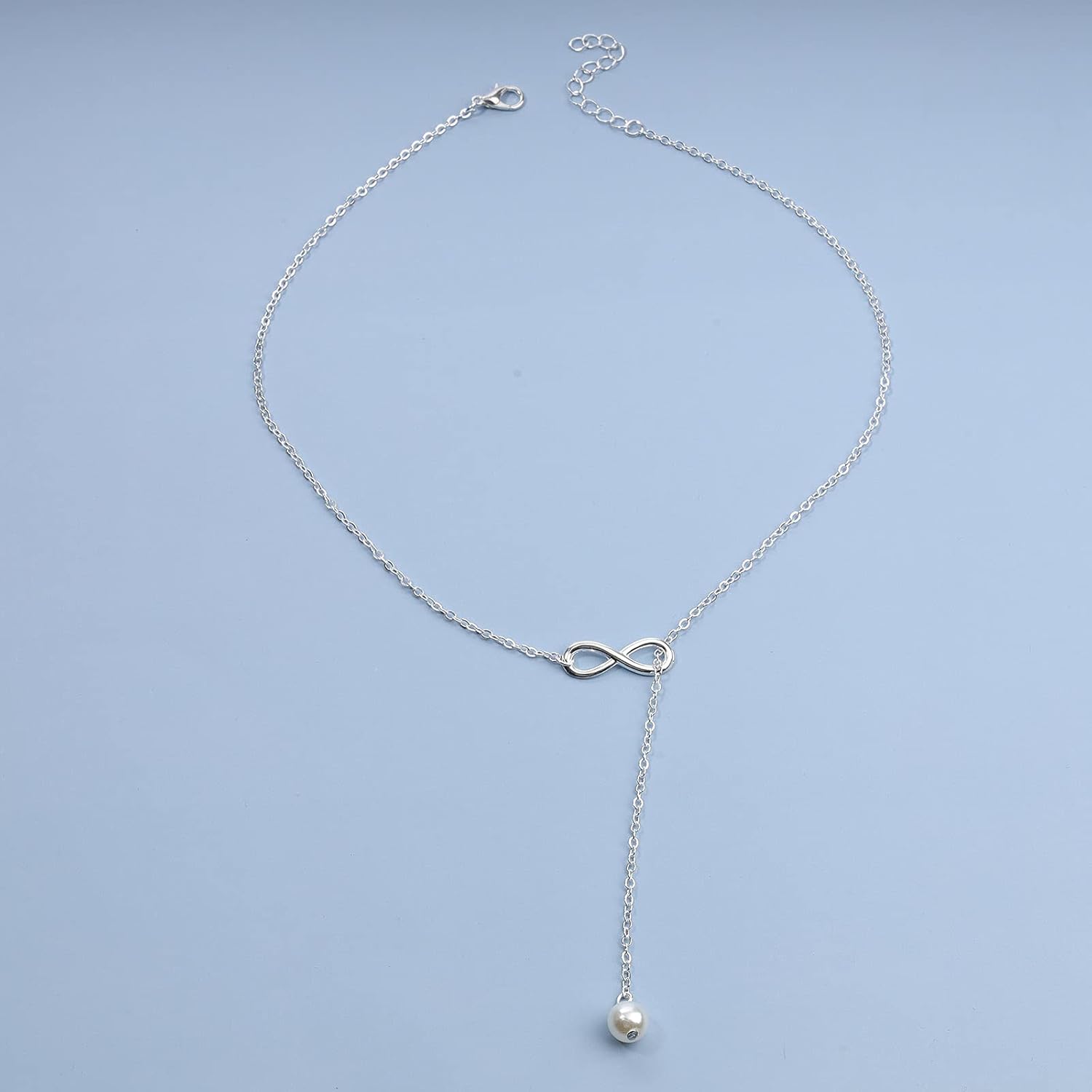 Boho Pearl Infinity Necklace Silver Y Pearl Necklace Minimalist Chain Y Lariat Necklace Chain Jewelry for Women and Girls
