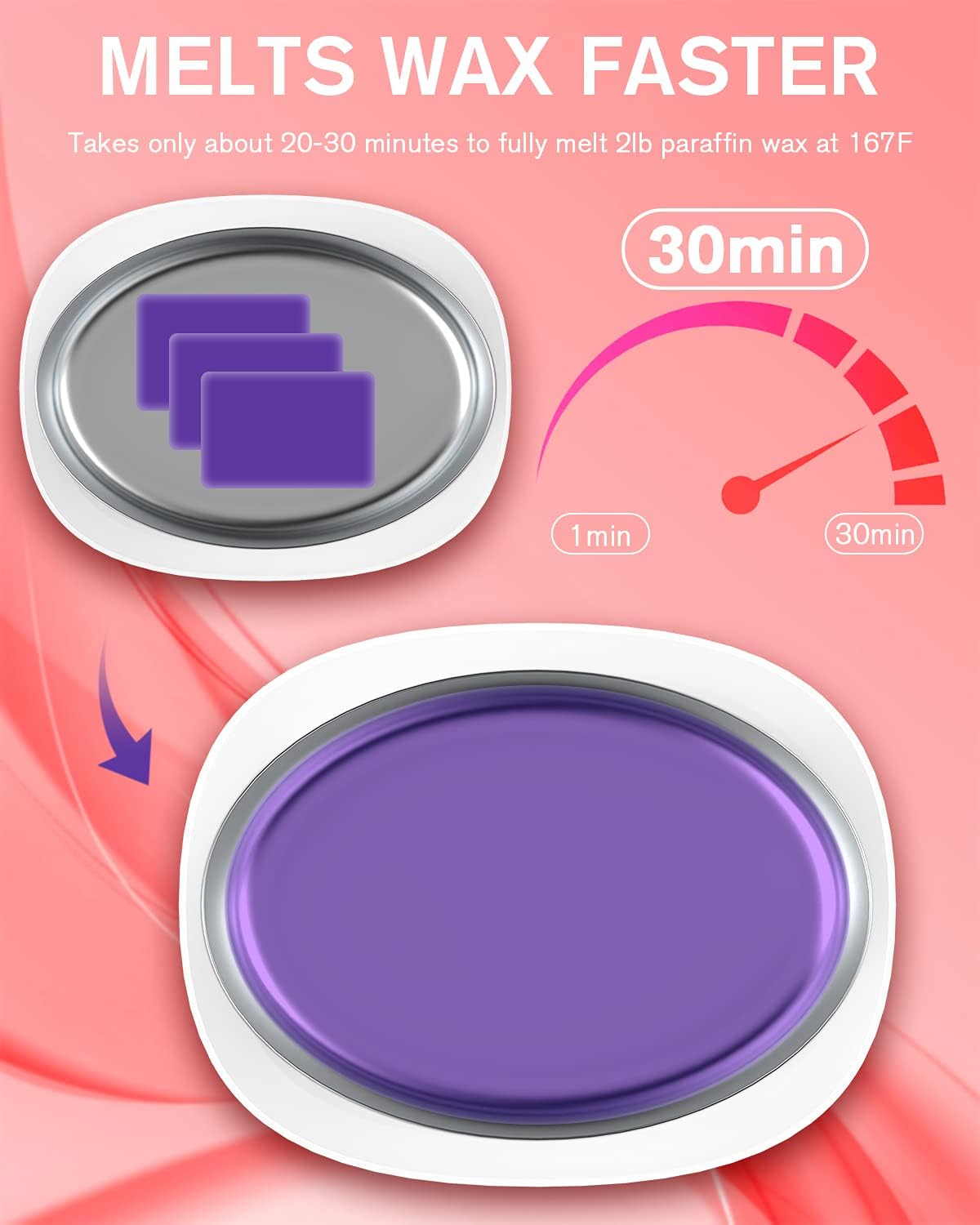 - Large Capacity / Quick Heat: paraffin wax machine has a large opening inner container , which offers you enough space to dip your hands, elbows or feet in paraffin warmer machine. Melts wax quickly and evenly , takes just 30 minutes to fully melt 2 lbs of paraffin wax at 167 Β°F. Turn Off the machine when dipping