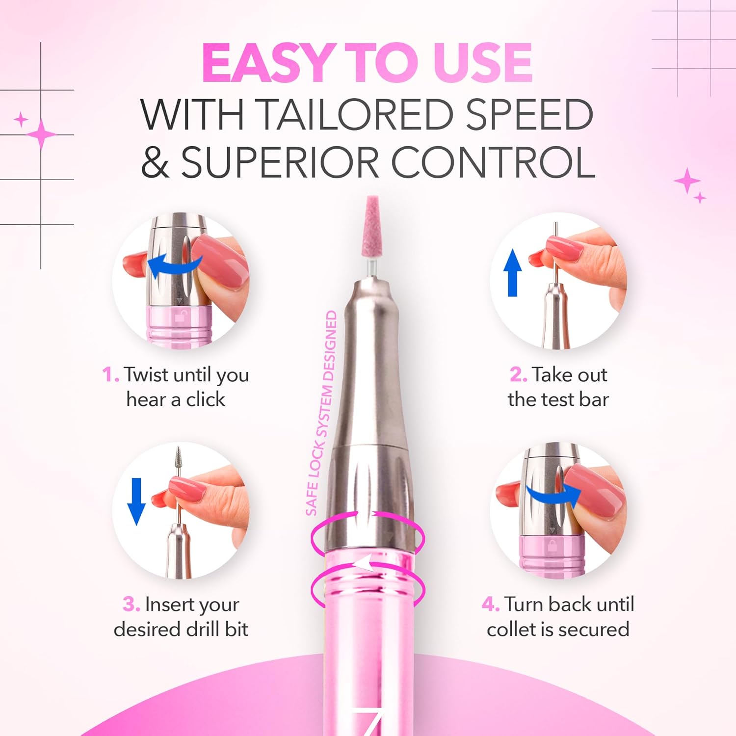 - Easy to use with Tailored Speed & Superior Control: Our nail drills come with adjustable speed gears, portable design, and long lasting battery. This portable nail drill is an essential tool for every respectable salon. Handle everything from gel polish removal to acrylic nail prep with ease.
