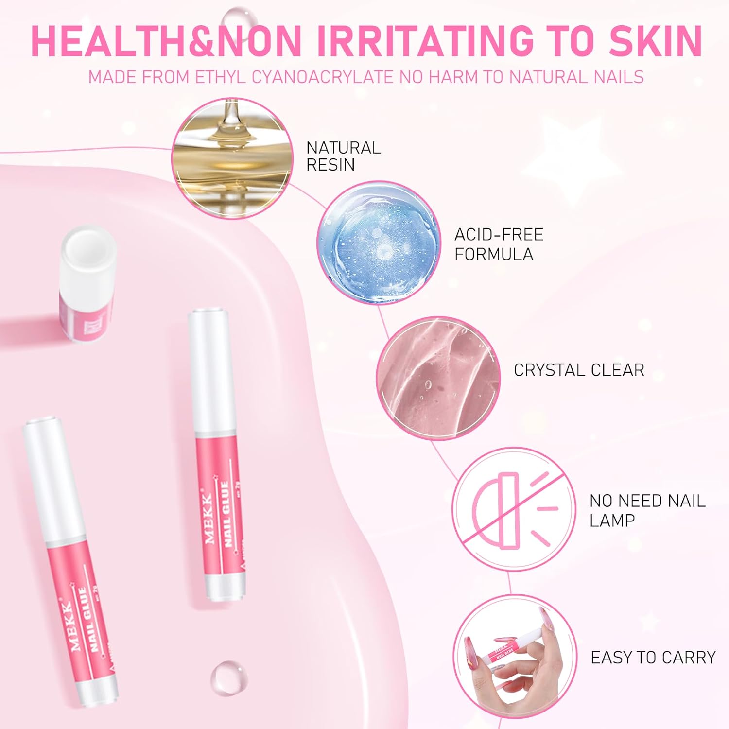 - HEALTHY MATERIAL&WIDELY USES:MEKK nail glue with MSDS certificated, made of natural resin, slight odor, no harm to your natural nails. Our nail glue is perfect for sticking false nails, broken nails and small nail art decorations such as rhinestone, beads & gemstone. MEKK nail glue can bring the salon home.