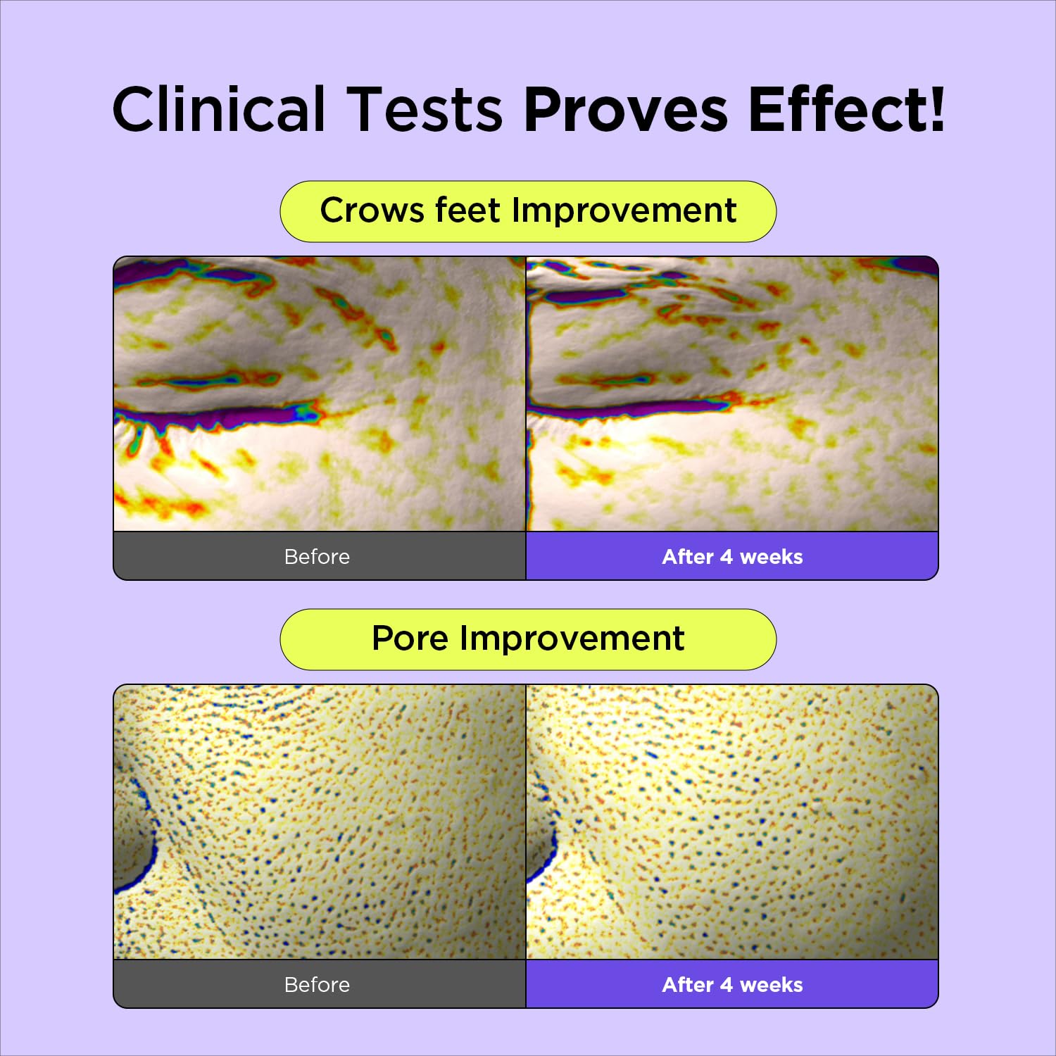 - ๐ NOTICEABLE RESULTS: โ Immediate effect on quantity, size, volume, and depth of the skin pore with one-time use โ Improvement on skin moisturizing, eye wrinkle, skin elasticity, face lift (cheek), skin density and skin texture (roughness) with 4 weeks use ๐FLUORESCENT YELLOW COLOR IS THE NATURAL COLOR OF RETINAL ๐