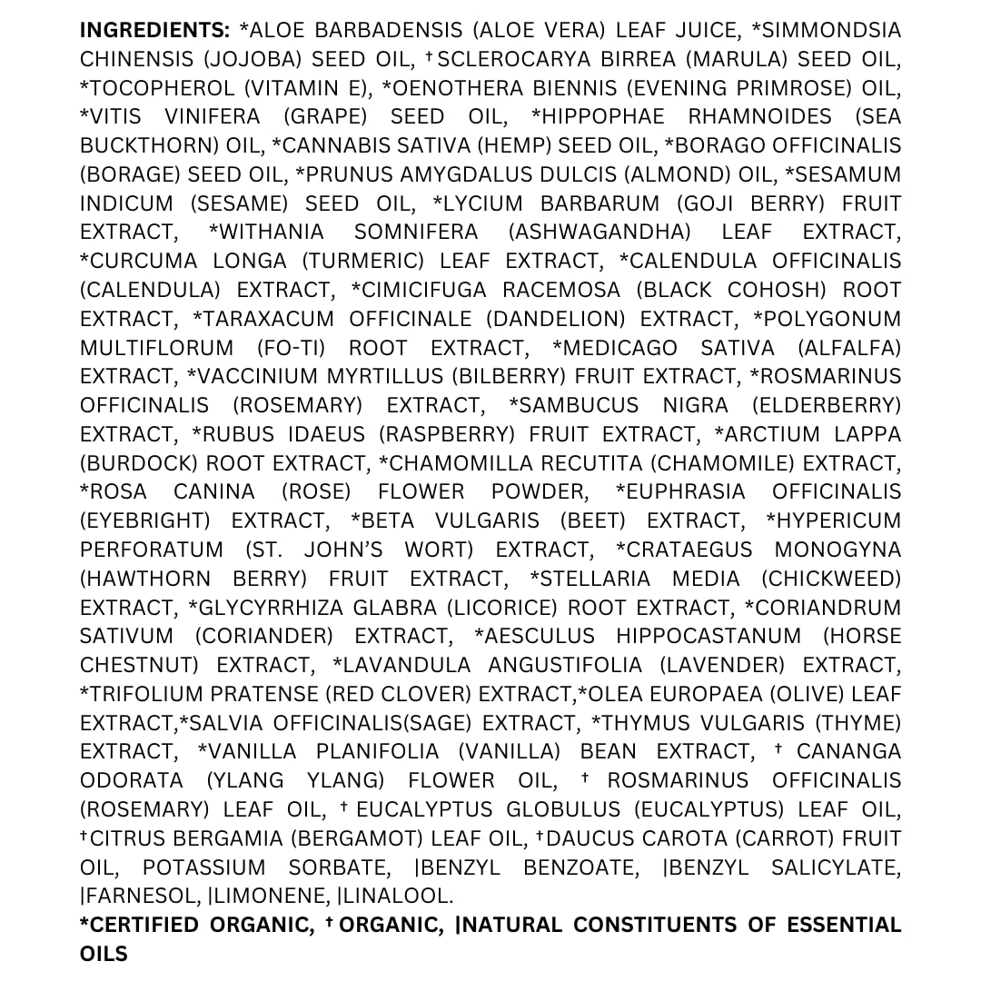 - Active Ingredients : *Aloe Vera Leaf Juice, *Jojoba Oil, †Marula Oil, *Vitamin E, *Evening Primrose Oil, *Grape Seed Oil,*Sea Buckthorn Oil, *Hemp Seed Oil, *Borage Seed Oil, *Almond Oil, *Sesame Oil, *Goji Berry, *Ashwagandha, *Turmeric, *Calendula, *Black Cohosh, *Dandelion, *Fo-Ti Root, *Alfalfa, *Bilberry, *Rosemary, *Elderberry, *Raspberry Leaf, *Burdock, *Chamomile, *Rose Hips, *Eyebright, *Beetroot, *St. John’s Wort, * Hawthorne Berry, *Chickweed, *Licorice, *Coriander, *Horse Chestnut, *Lavender, *Red Clover, *Olive Leaf, *Sage, *Thyme, *Vanilla Extract, †YlangYlang Essential Oil, †Rosemary Essential Oil, †Eucalyptus Essential Oil, †Bergamot (FCF) Essential Oil, †Carrot Essential Seed Oil, Potassium Sorbate *Aloe Vera Leaf Juice, *Jojoba Oil, †Marula Oil, *Vitamin E, *Evening Primrose Oil, *Grape Seed Oil,*Sea Buckthorn Oil, *He… See more