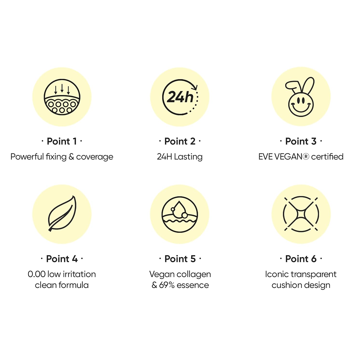 - Clean & vegan cushion Its formula & package is free of any animal products or by-products and is certified by EVE VEGAN.