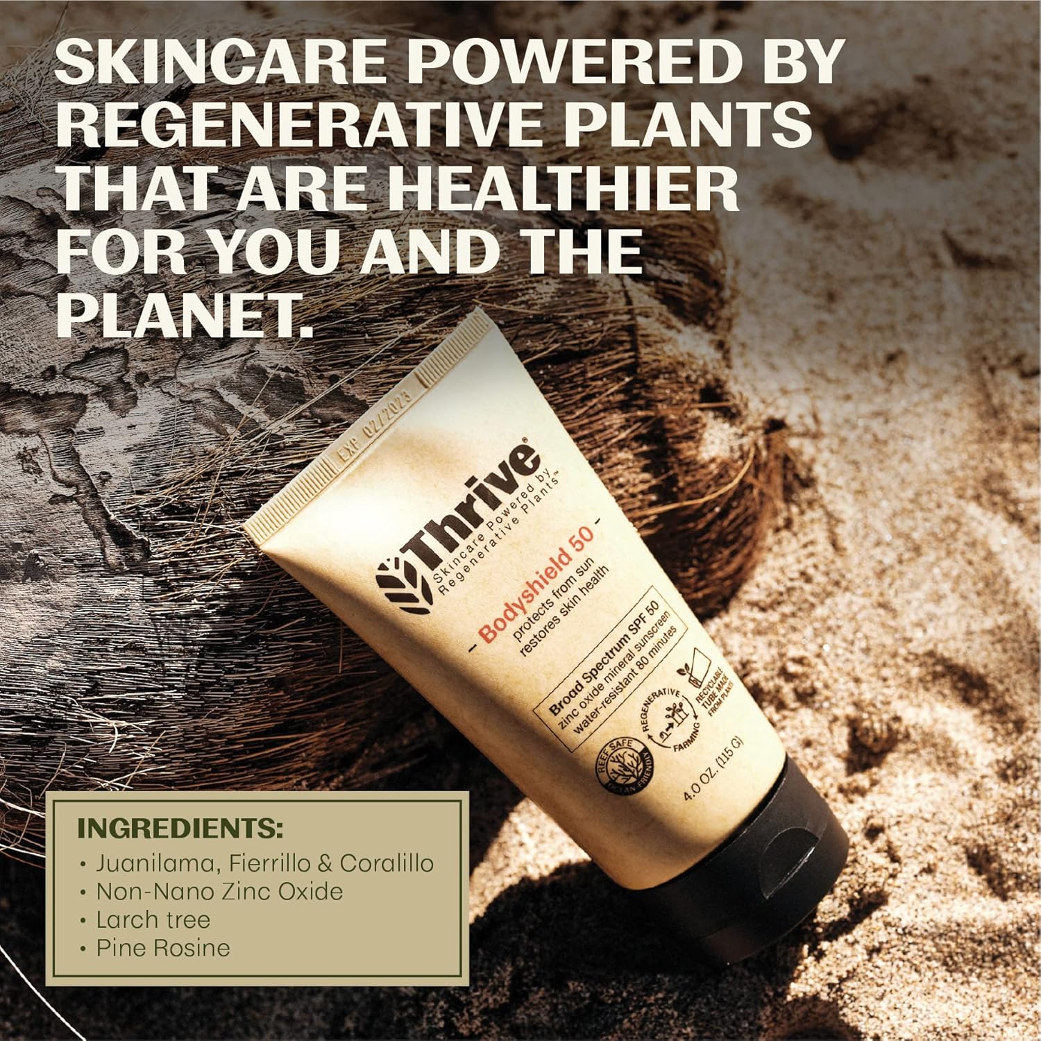 - NATURAL SPF PROTECTION - SPF 50 Sunscreen powered by Thriveβs antioxidant rich Costa Rican super-plants, Juanilama, Fierrillo & Coralillo, delivered in a tube made from recycled plastic, for a lighter environmental footprint. Our regenerative plant-derived formula helps reduce irritation and redness while repairing skin from sun exposure.