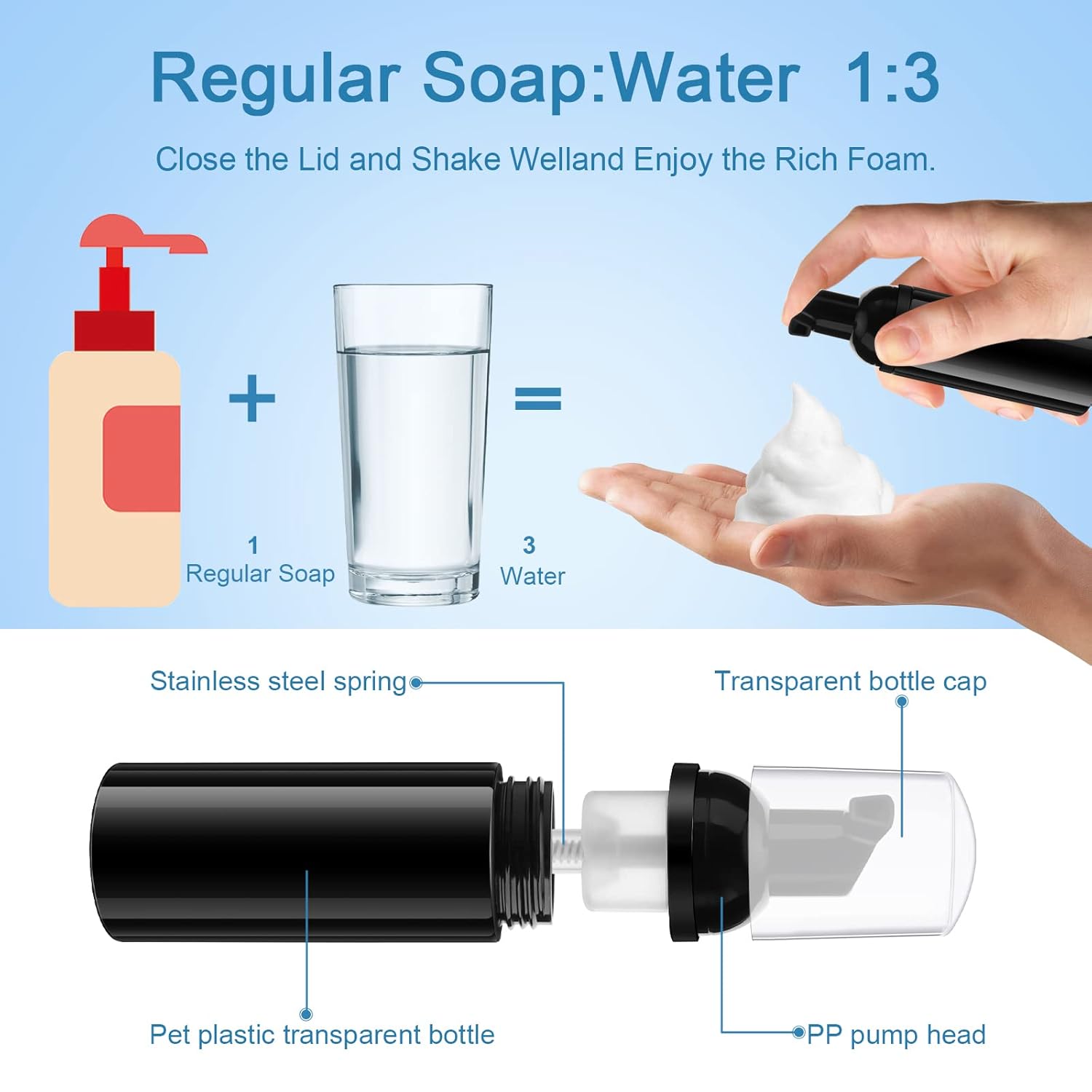 - 【Portable Eyelash Shampoo Bottles】These about 60ml foam pump bottles are made of PET material, and the spring-loaded button ensures that there is enough liquid to spray into a foam. You can make your own lash cleanser as a gift to a new client's lash extension cleanser. It is also the perfect container for trips, excursions, trips.