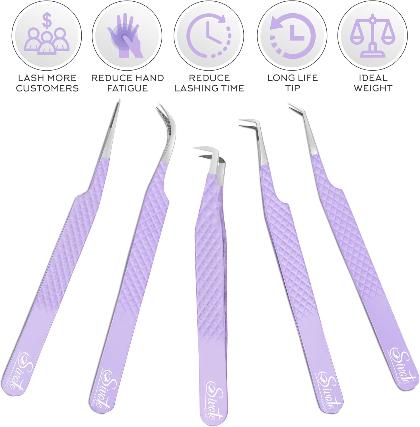SIVOTE Lash Tweezers for Eyelash Extensions, Pack of 5 Purple – Lash Extension Tweezers Set with Diamond Grip, Precision Fiber Tip for Volume Eyelash Extensions