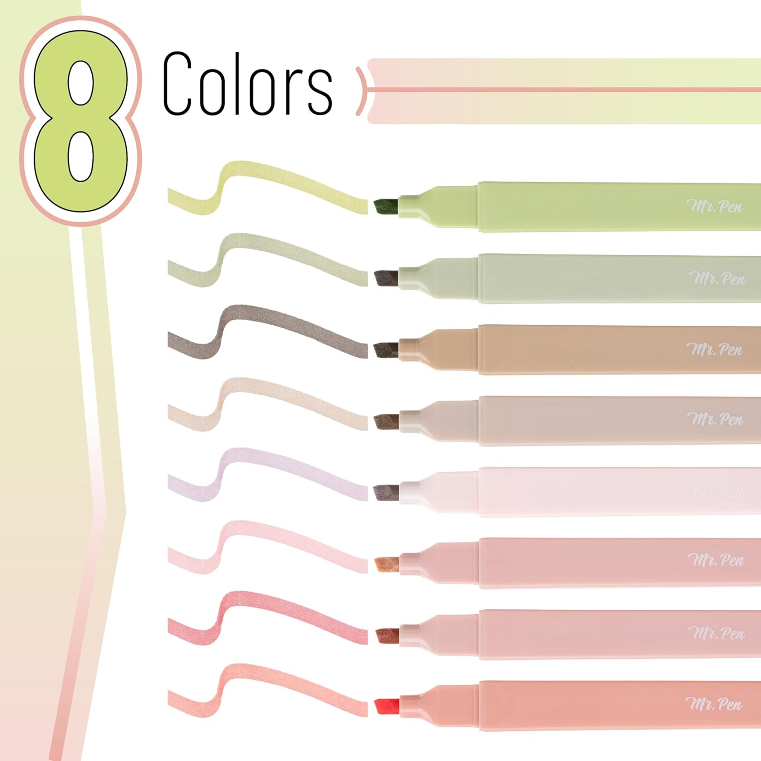 - Make your notes and papers pop with our soft and gentle highlighters! This package includes 8 highlighters in non-neon, assorted colors. Our highlighters are perfect for making your work and school life a little bit brighter.