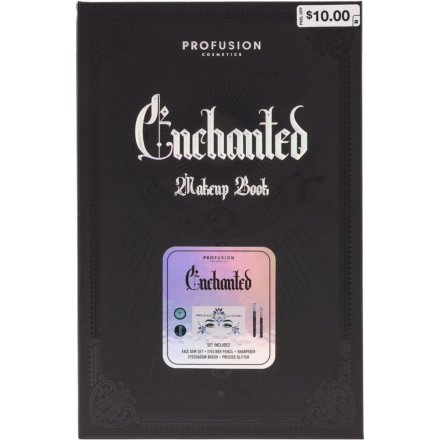 - Create magical looks with this Enchanted Face Kit Spell Book included: Self-adhesive face gems, Pressed glitter, Eyeshadow brush, Somber black eyeliner, Eyeliner sharpener