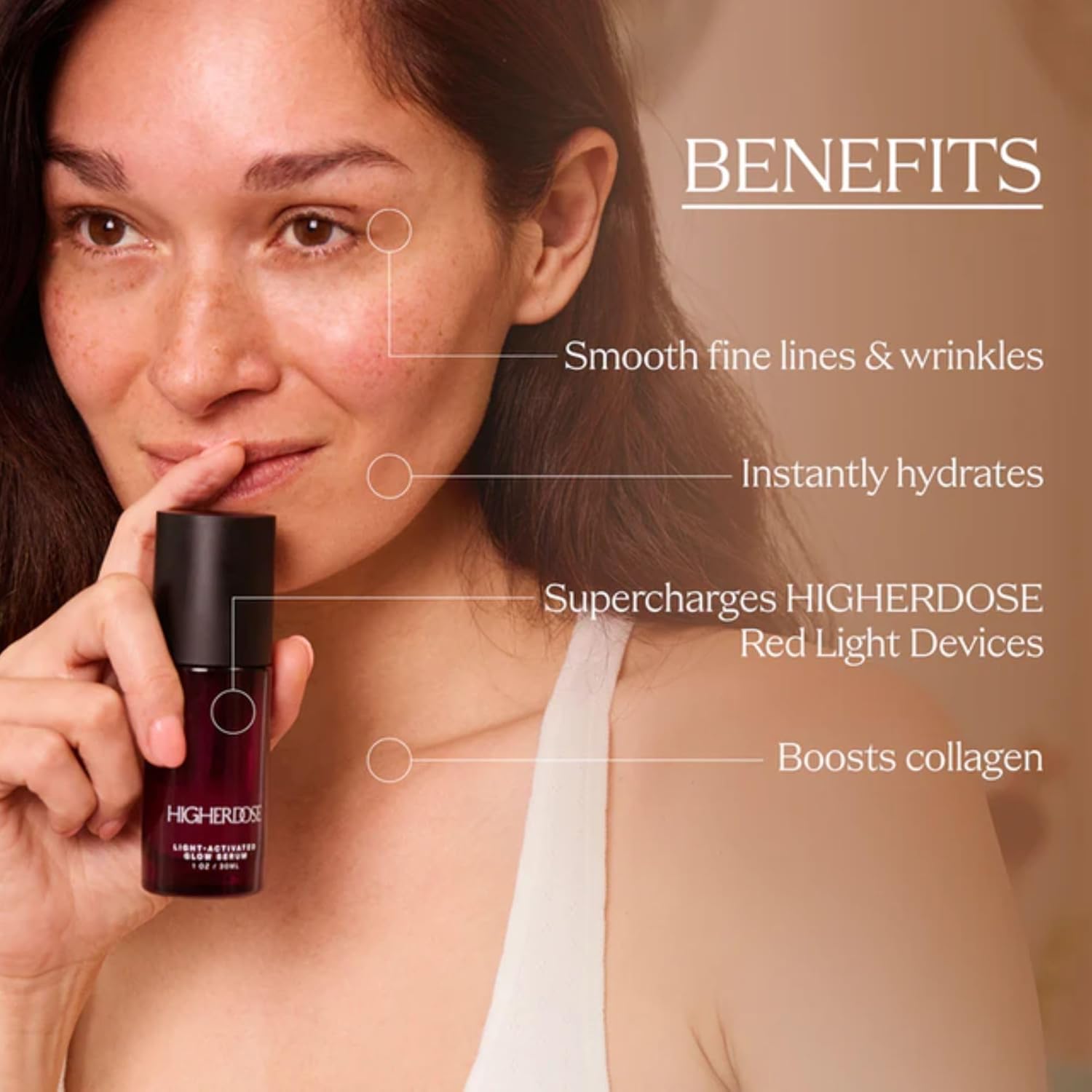 HigherDOSE Light-Activated GLOW SERUM - Anti Aging Face Serum to Plump, Hydrate & Smooth Fine Lines - Made with Vitamin C, Copper Peptides & Hyaluronic Acid - Boosts Benefits of Red Light (1 oz)