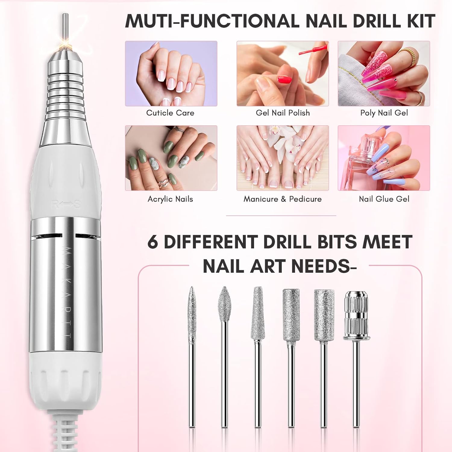 - Professional Drill Nails Machine for Acrylic: Makartt nail drills are suitable for both home and salon use. You will receive: 1x controller box, 1x drill handpiece, 1x power cord, 1x foot pedal 1x handpiece holder, 6 x drill bits, 6 x nail sanding bands and 1x user manual.