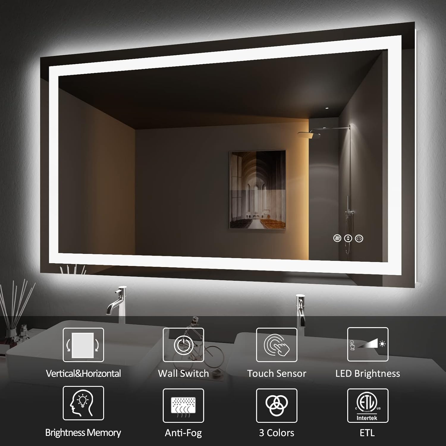 Amorho LED Bathroom Mirror 48'' X30'' with Front and Backlit, Stepless Dimmable Wall Mirrors with Anti-Fog, Shatter-Proof, Memory, 3 Colors, Double LED Vanity Mirror (Horizontal/Vertical)