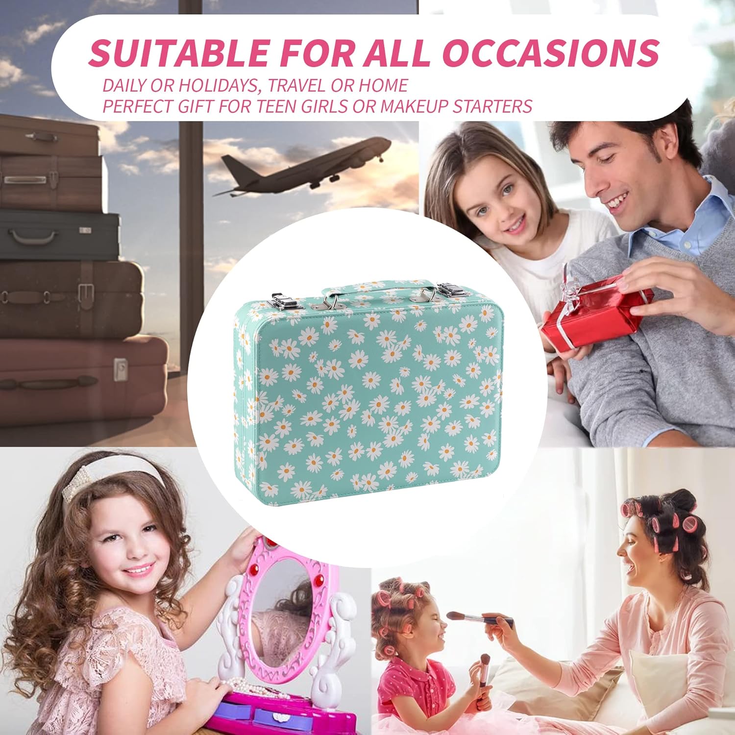 - REUSABLE MAKEUP CASE: Solid construction and vinyl material with daisy pattern make this girls makeup kit sturdy and look gorgeous. It can be reused to store beauty brushes, makeup tools, applicators, watches, sunglasses, Jewelry and other small things.