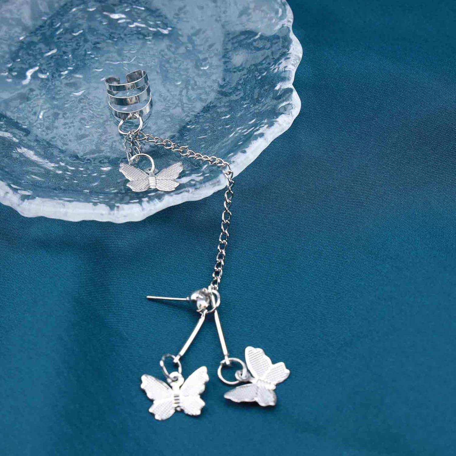Silver Butterfly Chain Tassel Cuff Earrings Vintage Long Butterfly Hinge Dangle Drop Earrings Single Butterfly Ear Clips Statement Butterfly Crawler Cuff Earrings Jewelry for Women Girls