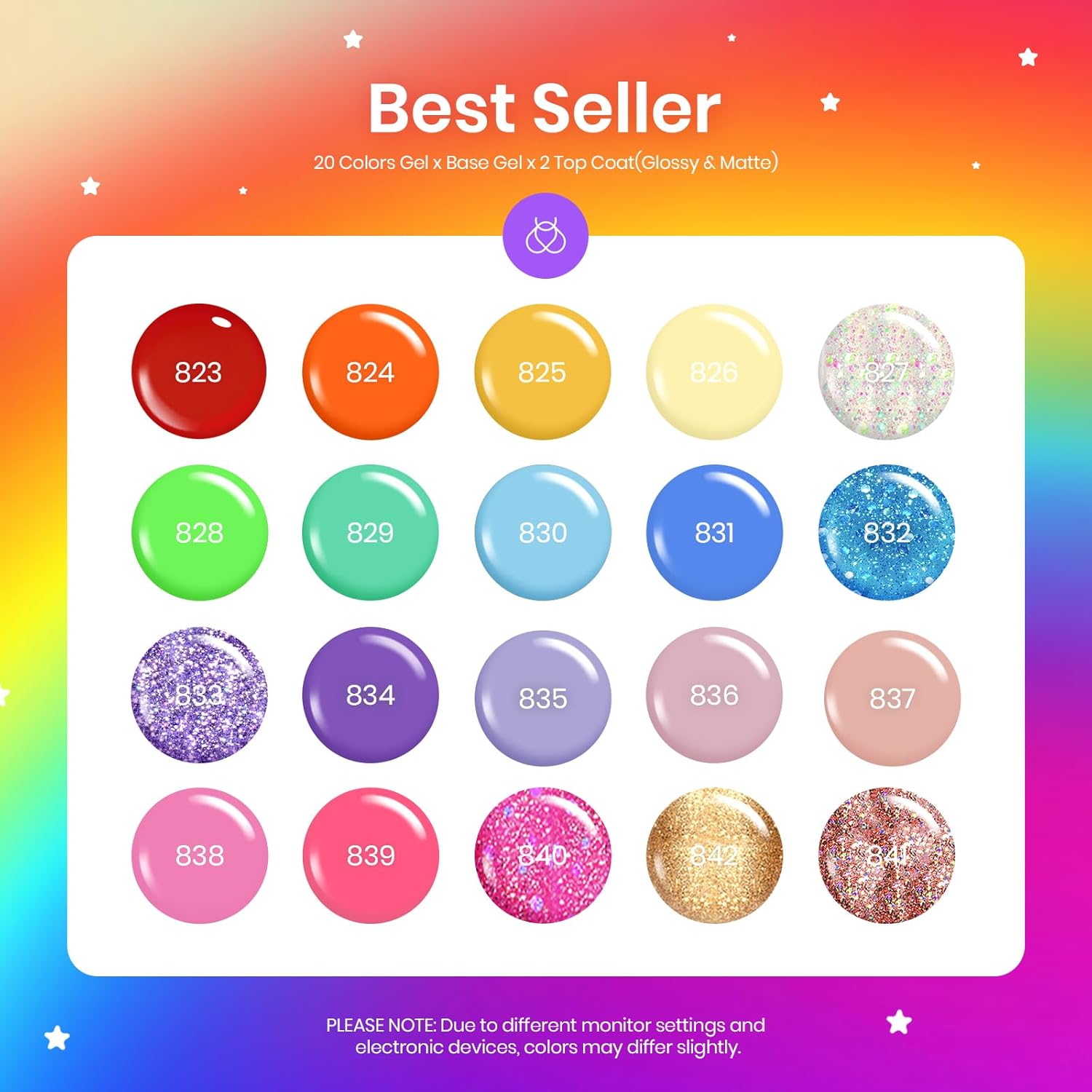 Beetles Rainbow Gel Polish Set, 20 Colors Glitter Pink Red Green Blue Bright Rainbow Collection Colorful Gel Polish Nails Sparkle Gel Base Glossy & Matte Top Coat UV Gel Gift for Women & Girls
