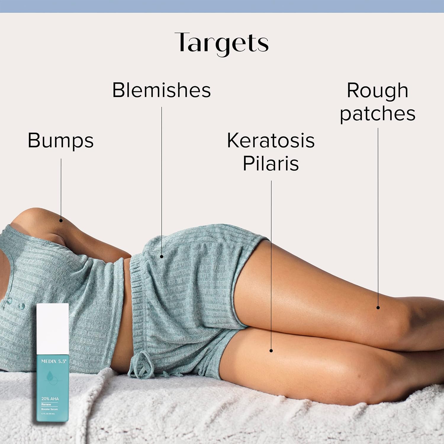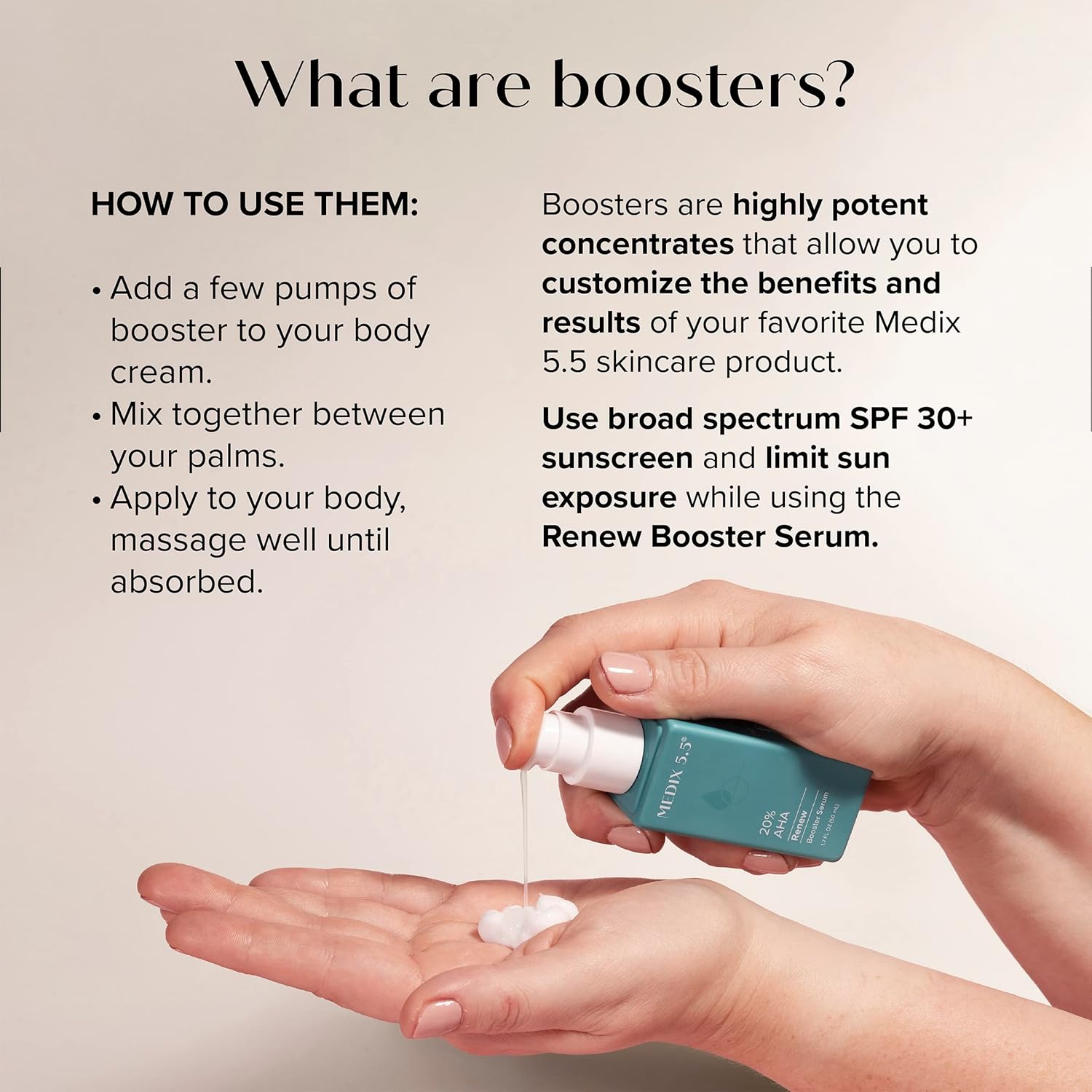 - BOOSTER β Supercharge your regular skin care routine by adding this highly effective + concentrated 20% AHA Exfoliating Glycolic Acid Renew Booster Serum formulated to be combined with your favorite Medix 5.5 body moisturizer treatment cream, but can also be added to your favorite body moisturizer, body oil, facial serum, face moisturizer, etc.