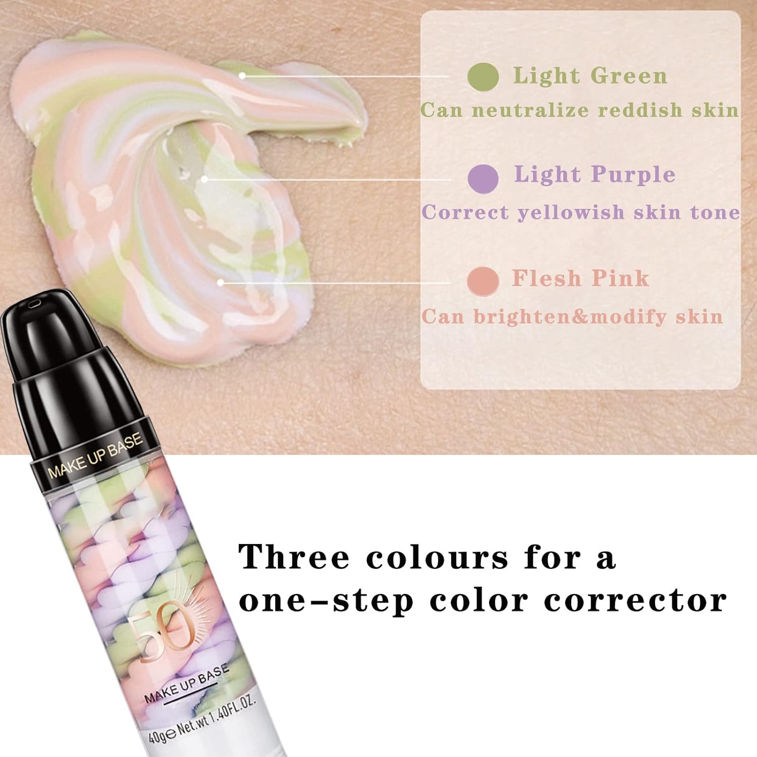 - 3 in 1 Facial Primer:Three color correcting pigments,light green,can neutralize reddish skin;light purple,correct yellowish skin tone;flesh pink,can brighten and modify skin