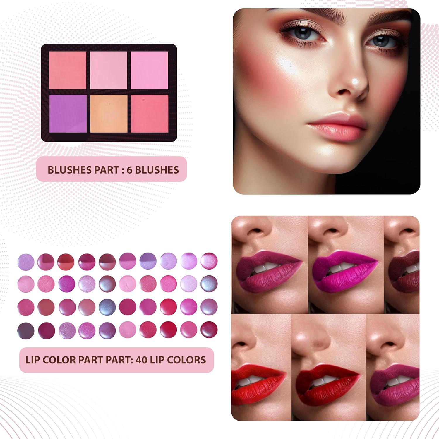 - Enhance your cheeks with our Professional Makeup Kit, featuring 6 versatile blush shades. From subtle rosiness to bold warmth, these Blush shades are perfect for women of all skin tones, providing a natural, radiant flush for a glowing complexion.