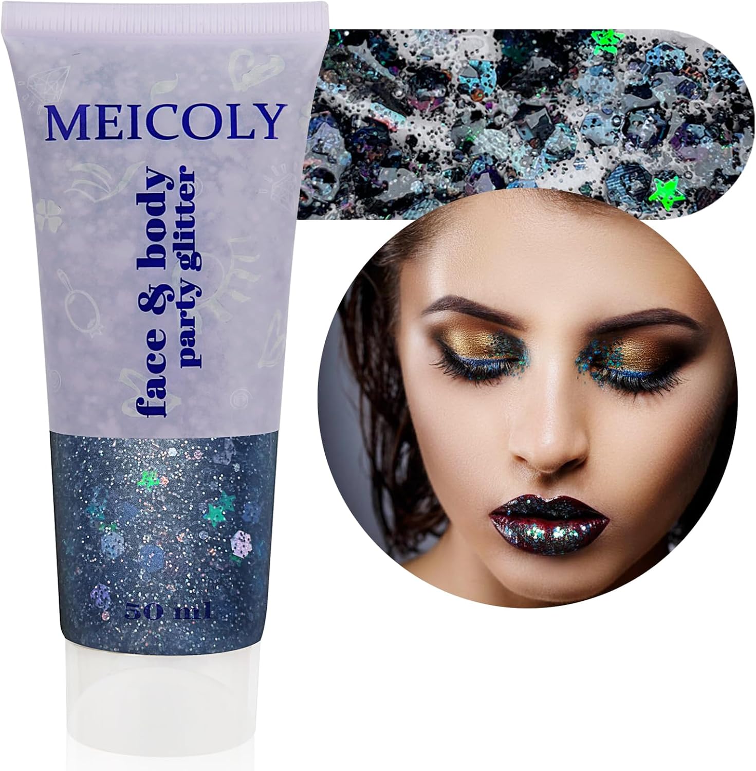 MEICOLY Black Glitter, Professional Body Paint, Mermaid Sequins Eye Glitter for Halloween Cosplay SFX Makeup, Chunky Face Gel for Women and Kids, 50ml