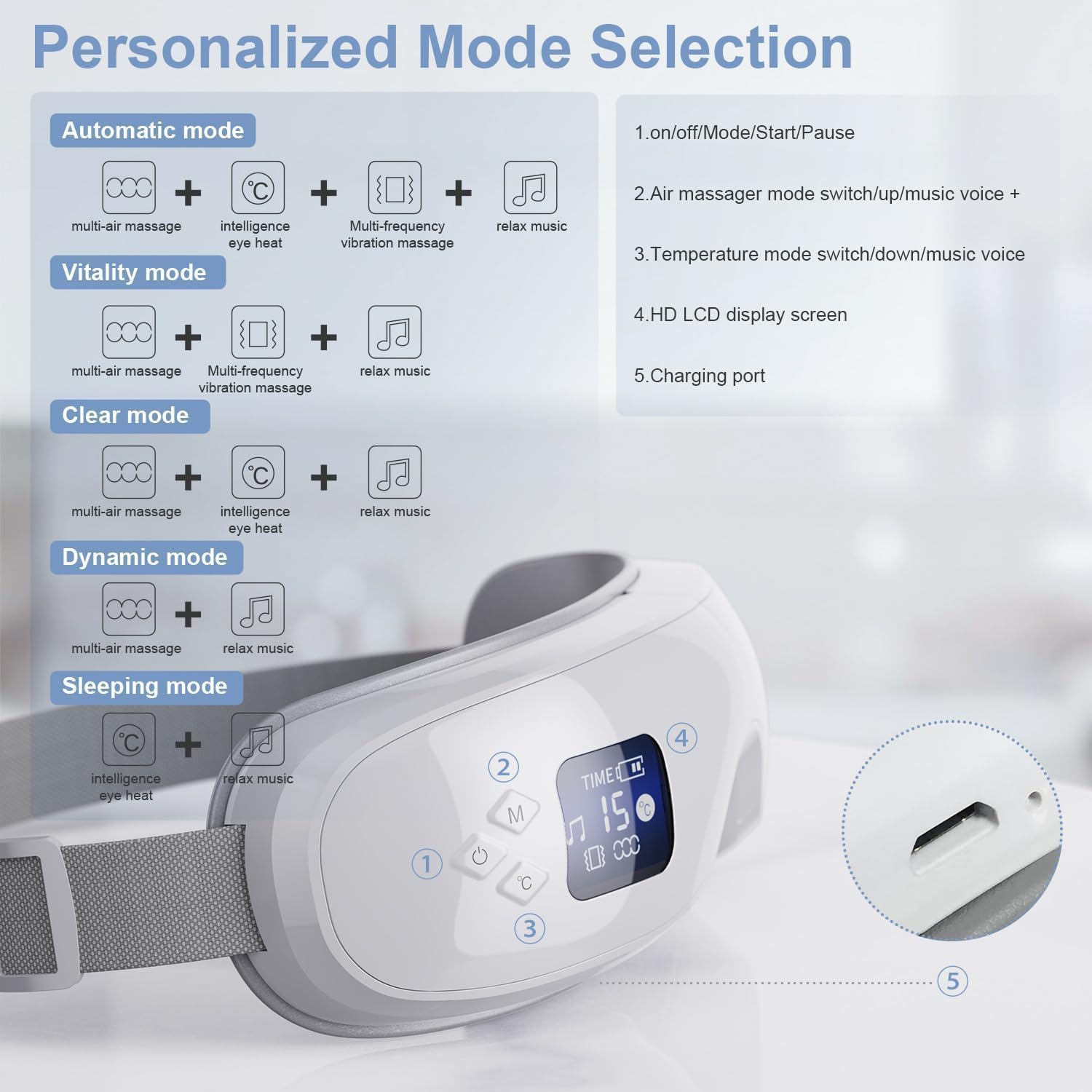 - Relax Your Eyes with 5 Modes - Our eye massager offers oscillating pressure and rhythmic percussion massage, helping to relax the skin around your eyes. With its heated function and Bluetooth music feature, it can soothe your eyes and provide effective migraine relief. Use it for 15 minutes before bed to enhance relaxation and improve sleep quality, or to refresh after a long day at work or study.