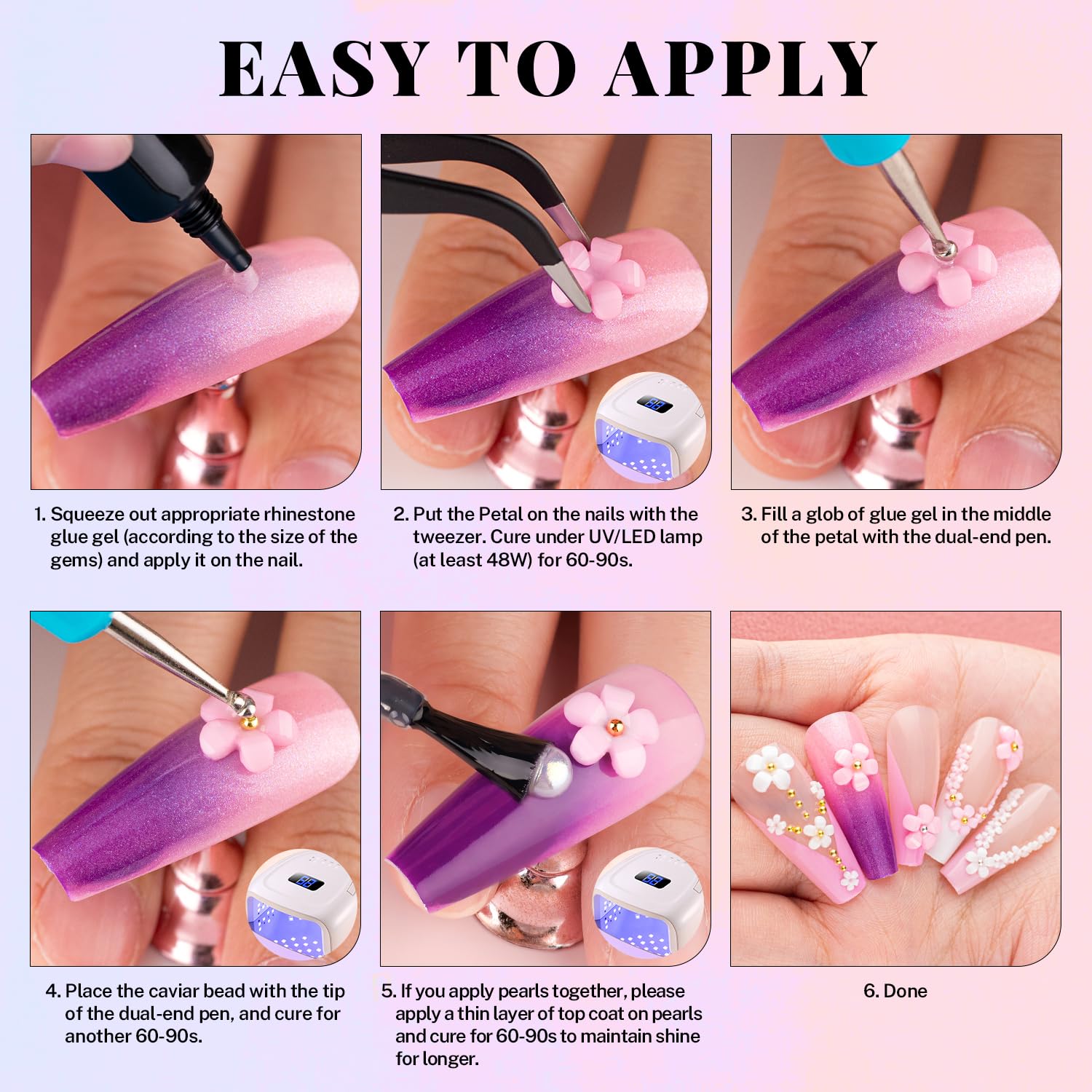 - 💎ADHESIVE GEL GLUE -- The crystal clear nail gem glue uses a special, non-toxic and eco-friendly formula with strong tackiness, adhesion, and fluidity for easily applying decorations. It is a type of UV gel glue. After proper application and curing under a UV/LED lamp, the glue dries clear with superior bonding strength that can last weeks without falling off. With the designed tip, you can easily and conveniently apply the glue to the nail bed or the surface of false nails.