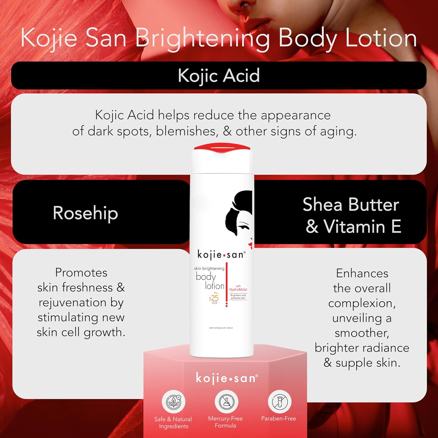 - Kojie San Body Lotion with Environmental Protection (250ml): New from Kojie San, this lotion is enriched with natural kojic acid. Now, combined with natural plant extracts & and environmental protection, it helps reduce uneven skin tone.