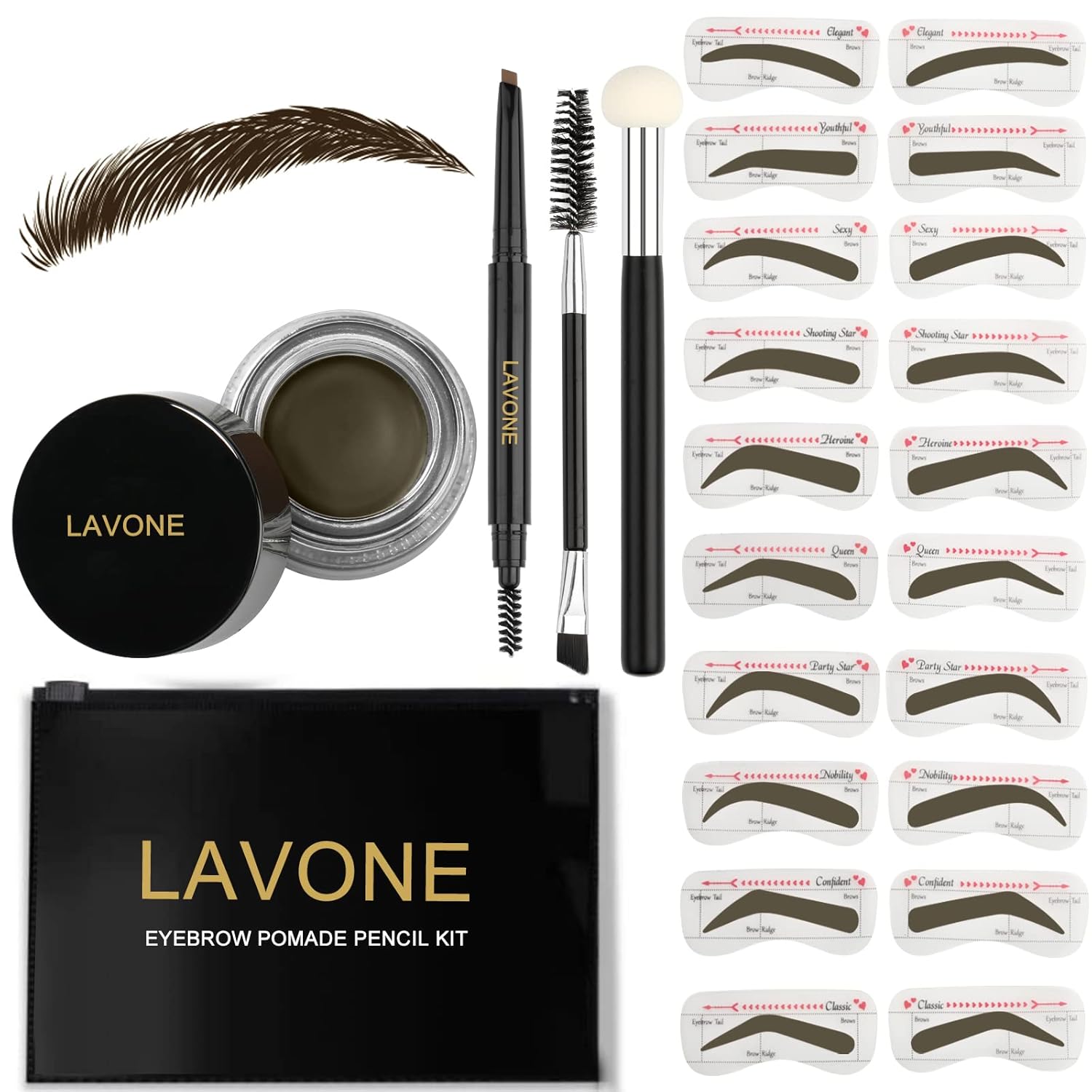- [Whatβs in the eyebrow kit]: LAVONE makeup eyebrow kit includes brow pencil, eyebrow powder 20 eyebrow stencils (10 different shapes), a sponge applicator, a dual precision brush and a zipper pouch for on the go.