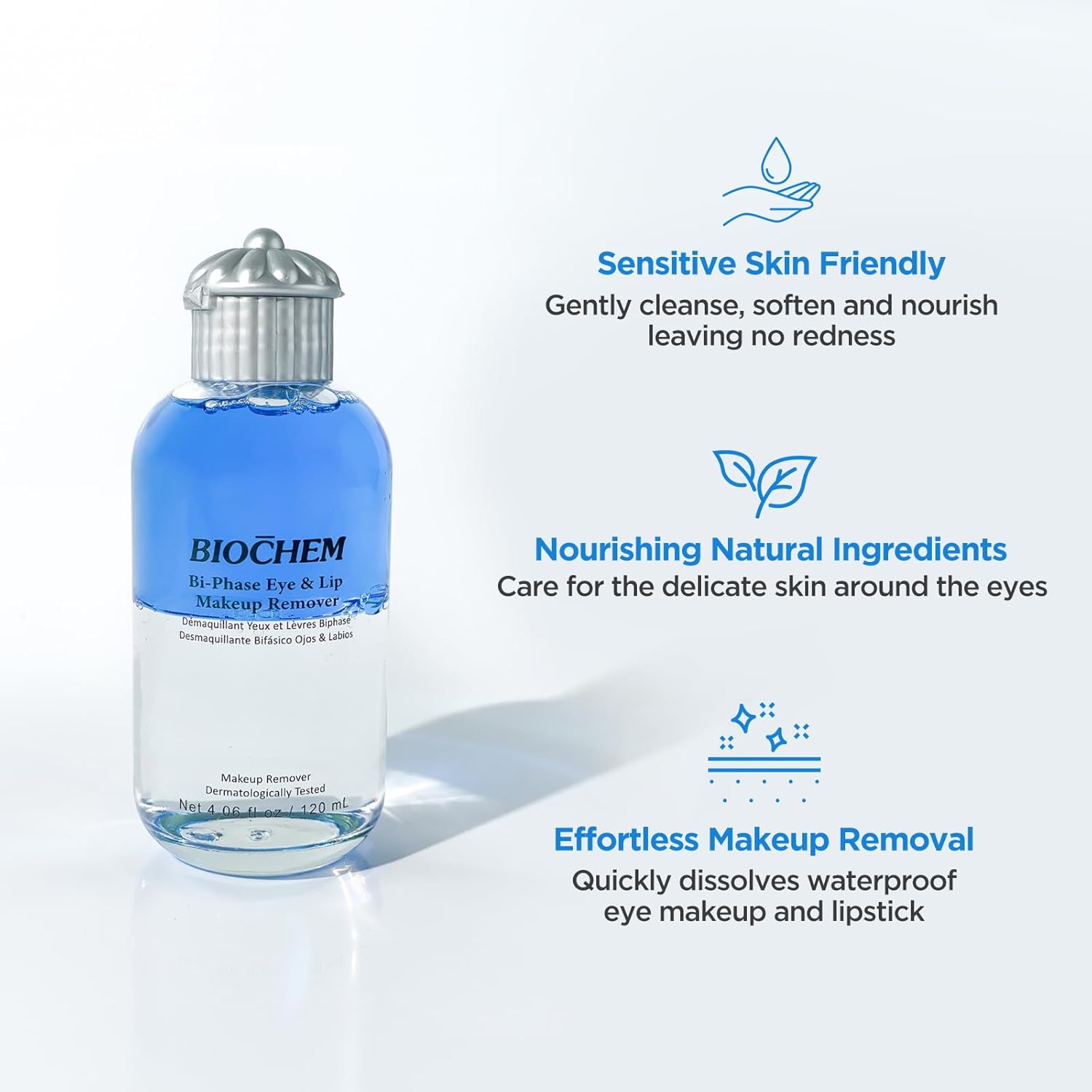 BIOCHEM Bi-Phase Eye & Lip Heavy Makeup Remover, Waterproof Mascara Remover, Gentle Cleanser liquid for Makeup with Natural Ingredients for Sensitive, Normal Skin Types (4.06 fl. oz / 120 ml)
