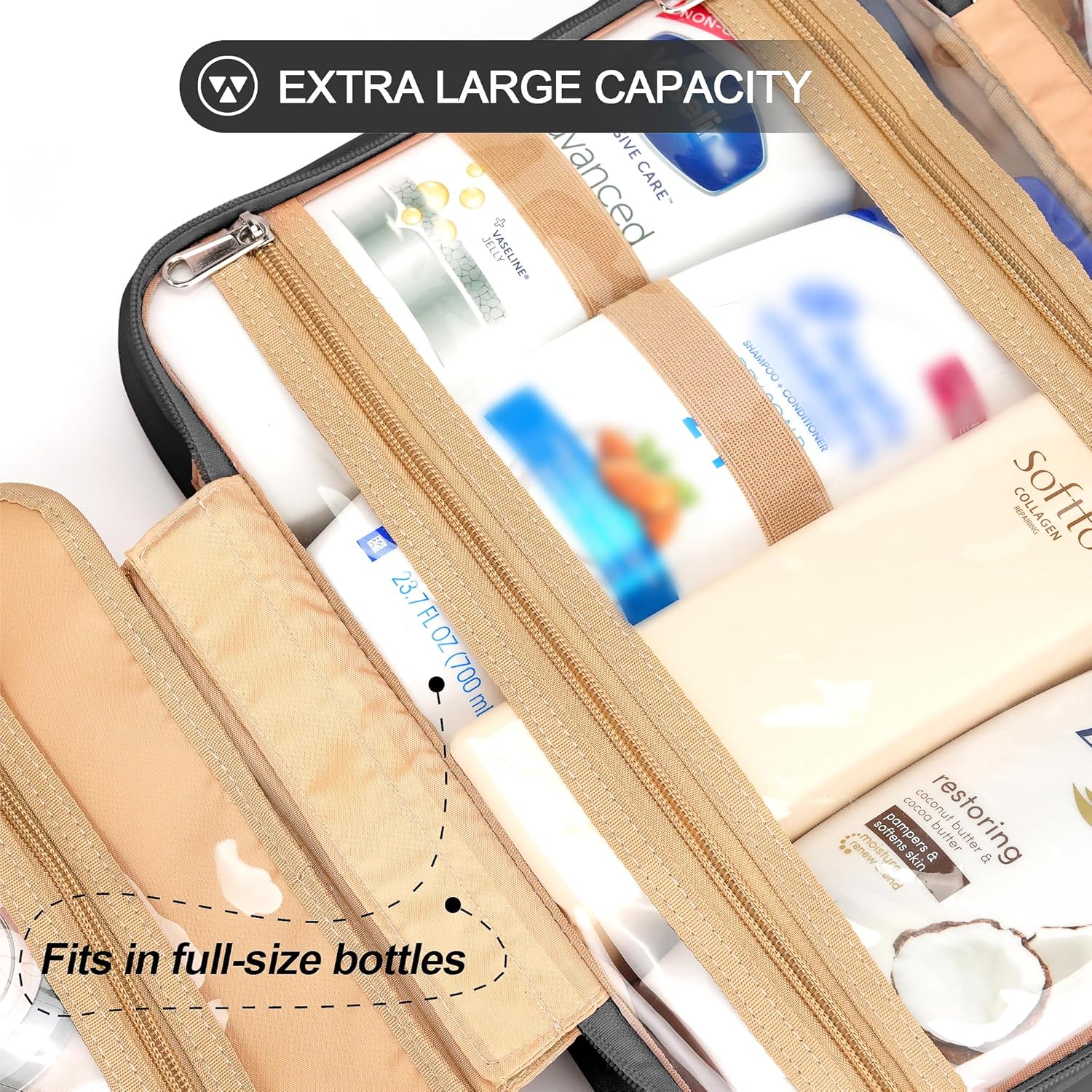 - CONSIDERABLE DESIGN - The elastic bands inside the two main compartments can keep the different height bottles fixed and upright. Your comb, toothbrush, razor, and leak-prone makeup can all go in there, even a hair dryer. 360Β° metal hook gives you a variety of hanging options.