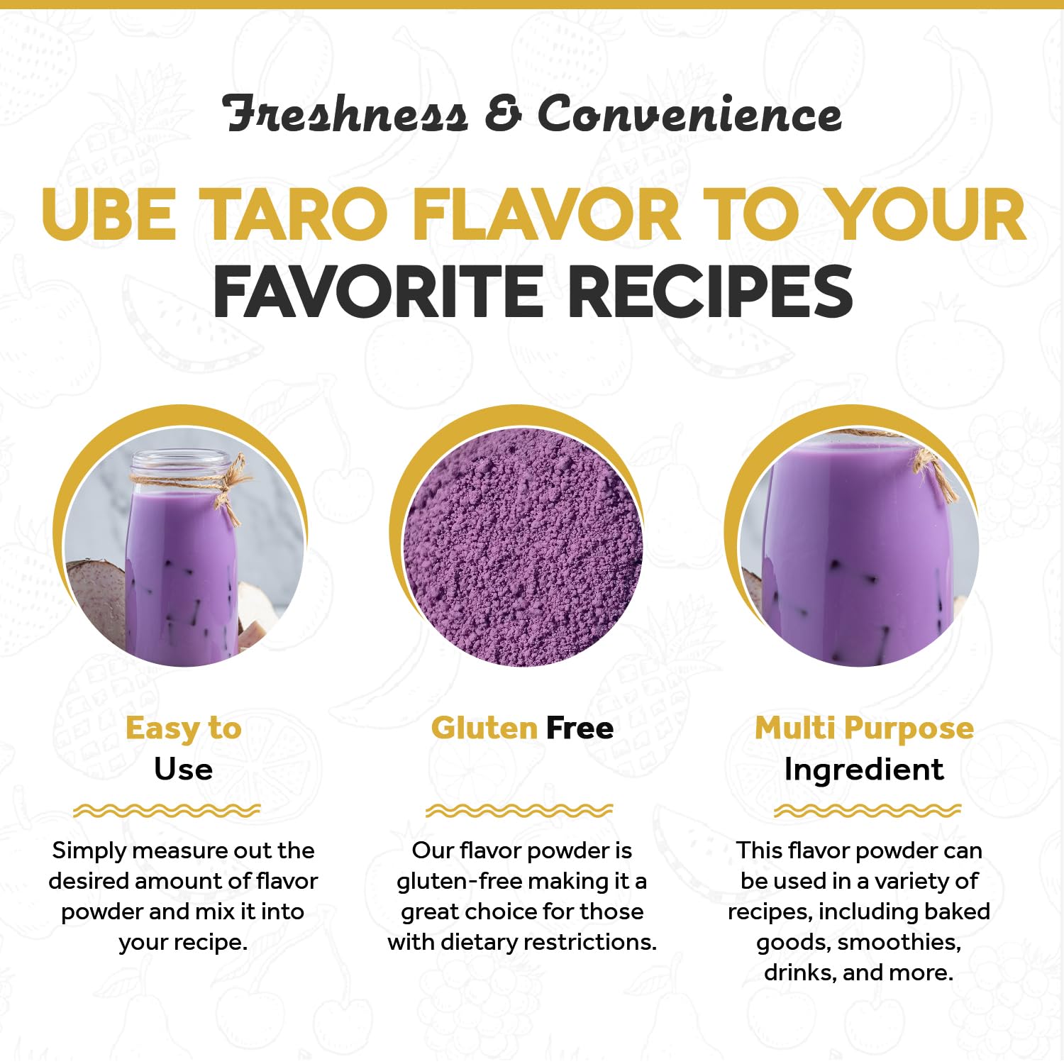 - ๐๐ฅ๐ฎ๐ญ๐๐ง-๐๐ซ๐๐ ๐๐ง๐ ๐ฏ๐๐ ๐๐ง: Our Ube Taro flavor powder is gluten-free and vegan, making it a great choice for those with dietary restrictions. It's a versatile ingredient that can be used in a wide range of recipes, including ones that are gluten-free or plant-based.