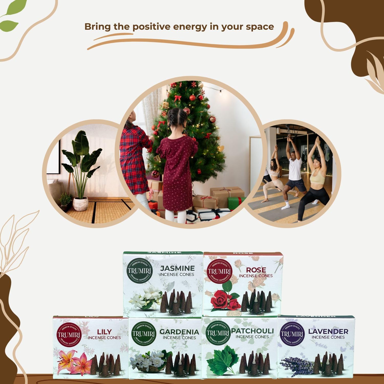 Trumiri Floral Incense Cones - Variety Pack - Total 60 Cone Incense (6 Scents x 10 Conos) - Rose, Lavender, Jasmin, Patchouli, Gardenia, Lily - Cone Incense Scents - Insense Cones - Incent Cone