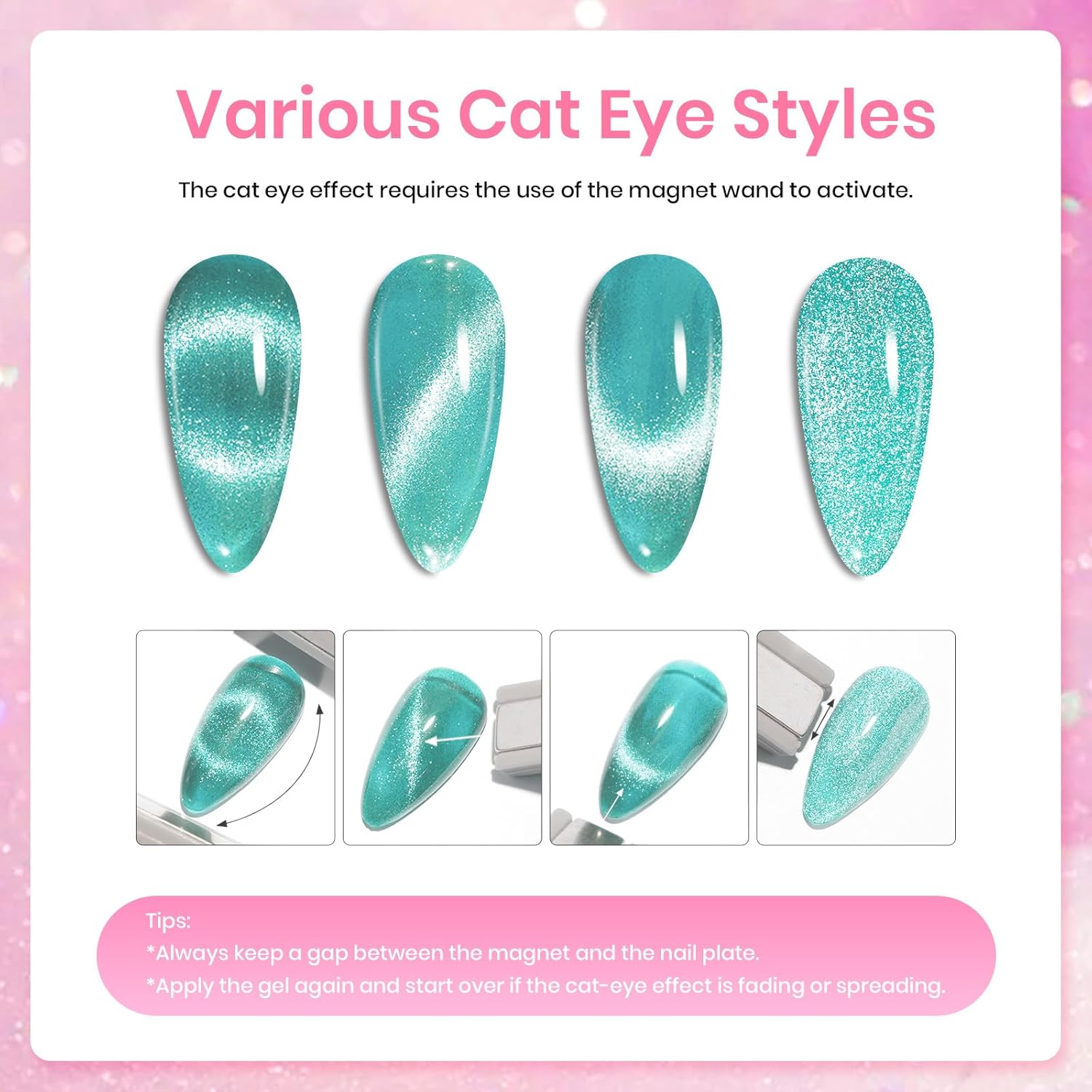 - ăValentines Gel Nail Polishă6 Colors Holographic Glitter Cat Eye Gel Polish of 7.5ml /0.25fl.oz each and one magnet for various cat eye nail art designs. Professional Uv Led cured cat eye gel nail polish for infinite styles. Tips: Place the magnetic stick over the surface about 3-5mm for 5-10 secs to get your desired effect !!!!!