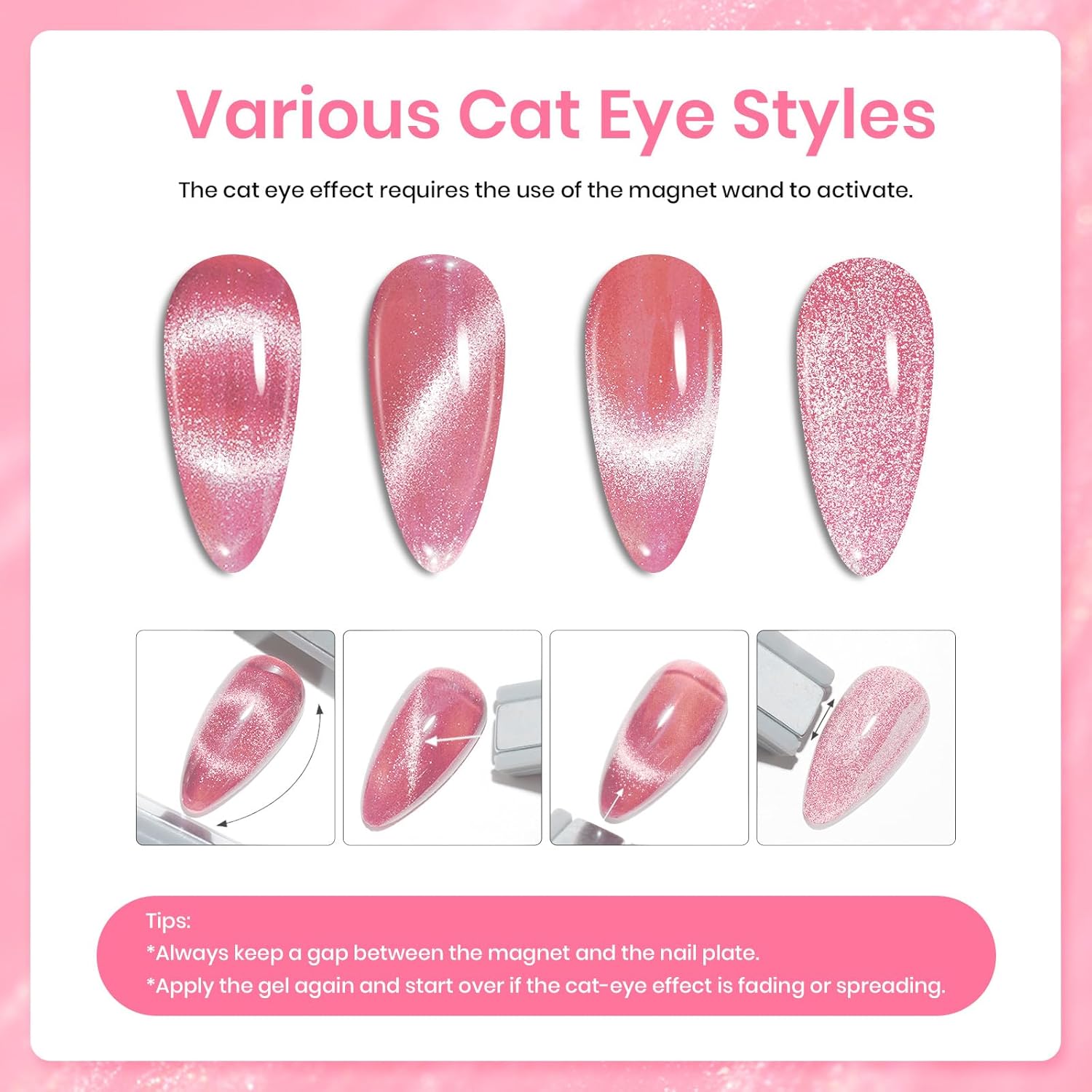 - ăWarm TipsăPlease conduct a skin test before use with glitter pink cat eye gel nail polish. Professionally formulated and only used for nails. Place the magnetic stick over the surface about 3-5mm for 5-10 secs to get your desired effect! After repeatedly sucking the cat eye color gel without any effect, the magnetic powder will become ineffective. You can add a layer to suck the cat eye gel again