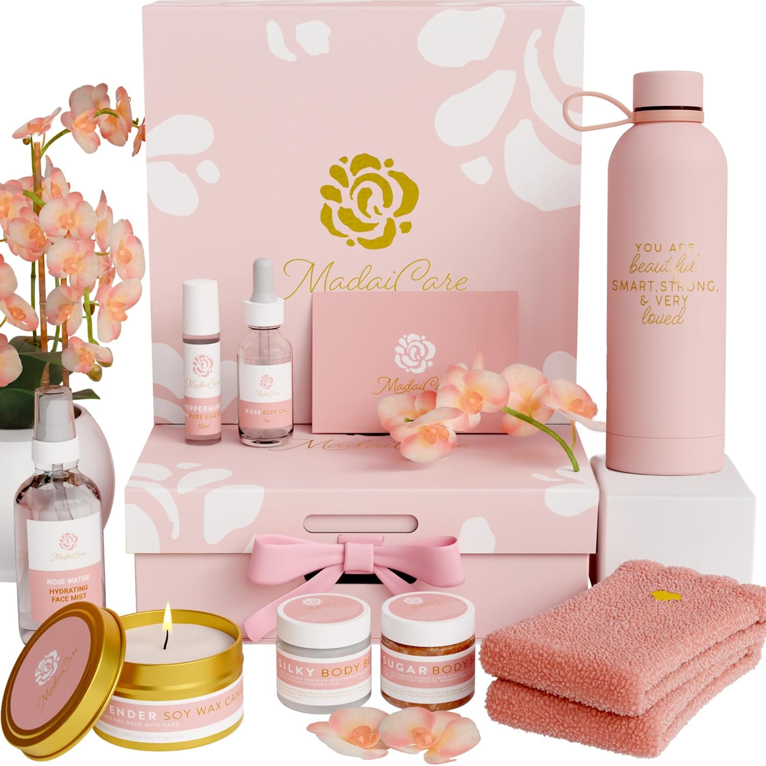- THE ULTIMATE SPA GIFT SET: Pamper yourself or a loved one with Madai Care’s luxurious spa gift set for women. This premium set includes cozy socks, exfoliating body scrub, hydrating mango body butter cream, soothing vanilla and lavender-scented candles, refreshing facial mist, nourishing body oil, invigorating roll-on peppermint, and a stylish insulated water bottle.