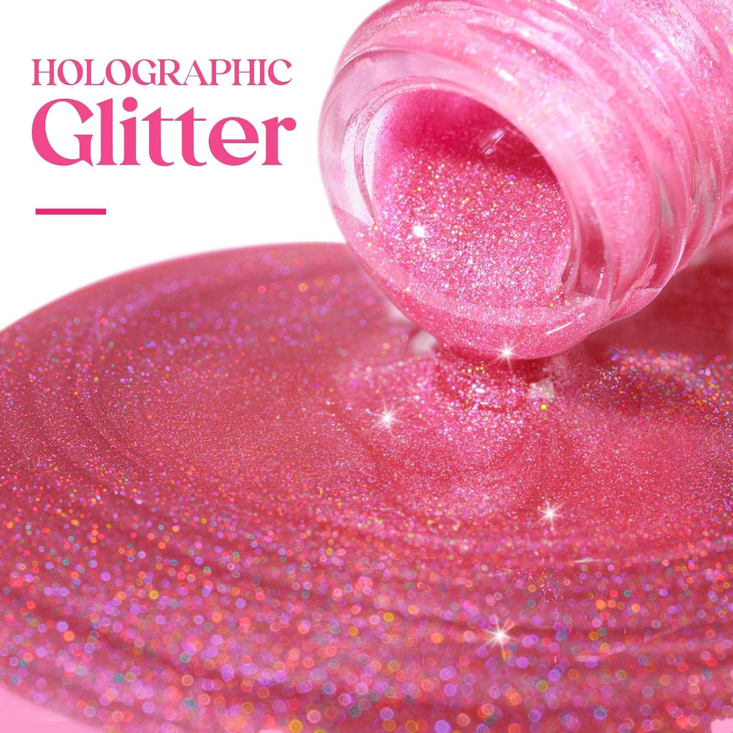 MIZHSE Holographic Nail Polish, Pink Glitter Nail Polish Air Dry Fast, 15 ml High Glossy Shimmer Nail Pigment Oil-based Laser Iridescent Nail Lacquer Chrome Halo Nail Art Salon Manicure Home