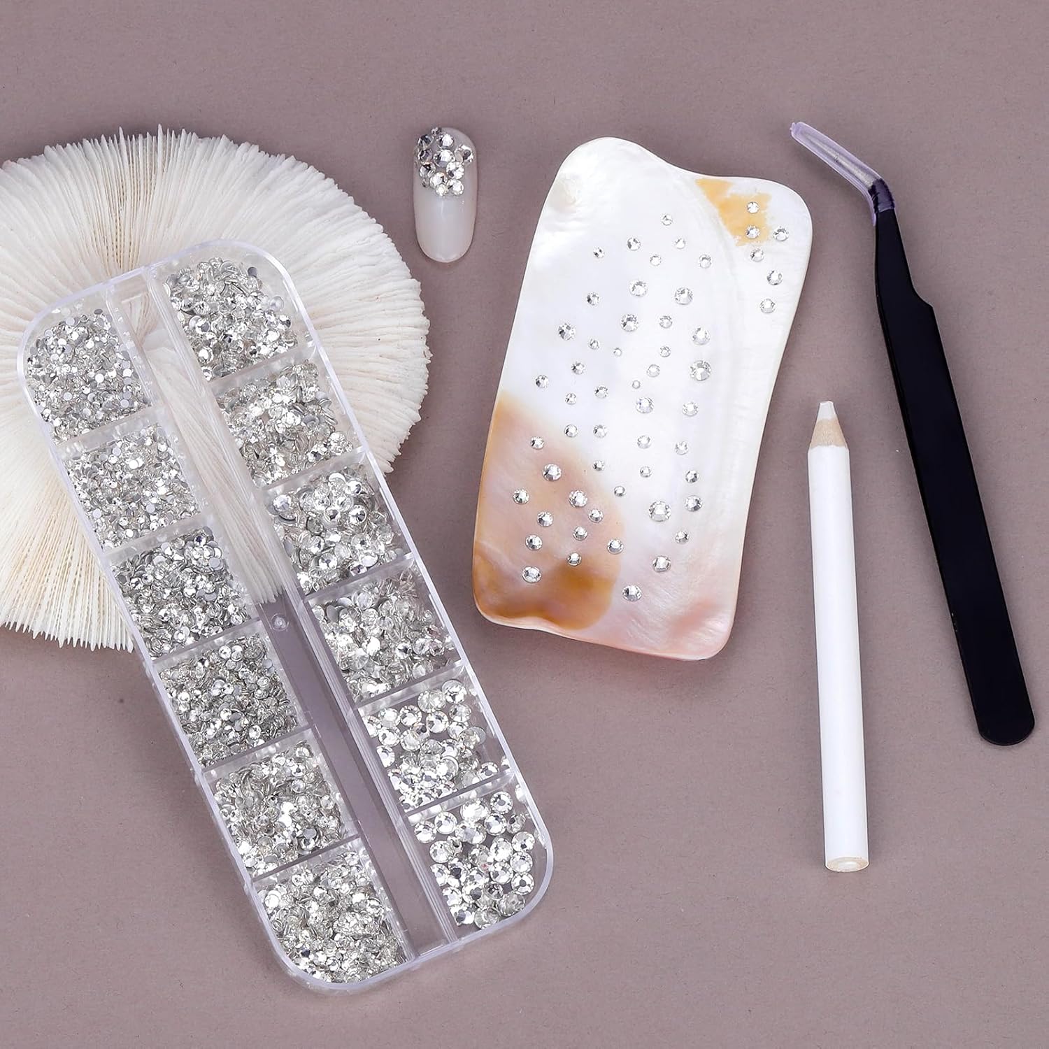 - 💎【Package】1 Box of White Rhinestones (6 sizes); 1 Box of Beige & White Half Round Pearls (6 sizes);2 Boxes of Mirco;1PCS of Picker Pen and 1PCS of Tweezer.